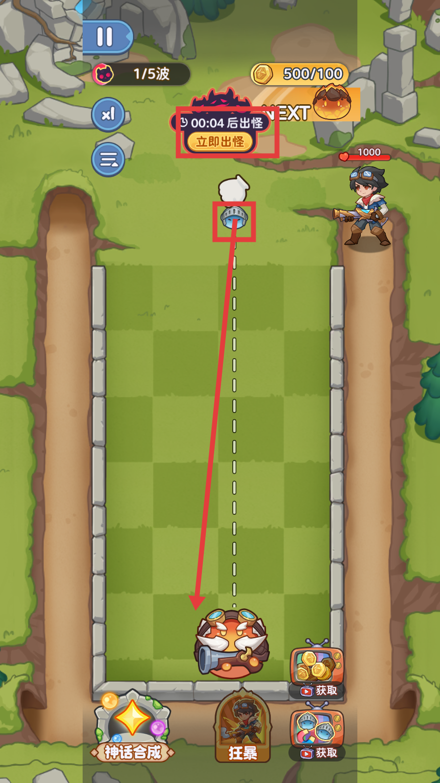 2、战斗时,若想快速推进,看到【立即出怪】按钮可点击,同时注意放置防御单位的位置,为后续波次做准备。