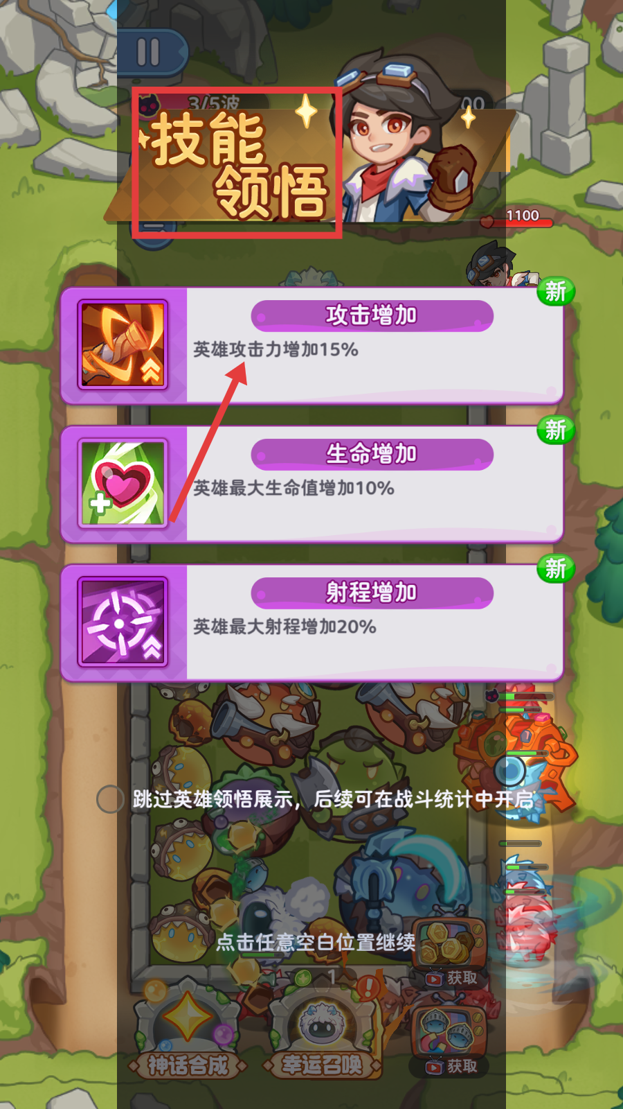 4、出现【技能领悟】时,根据需求选技能,优先选【攻击增加】能提升英雄15%攻击力,助力后续战斗。