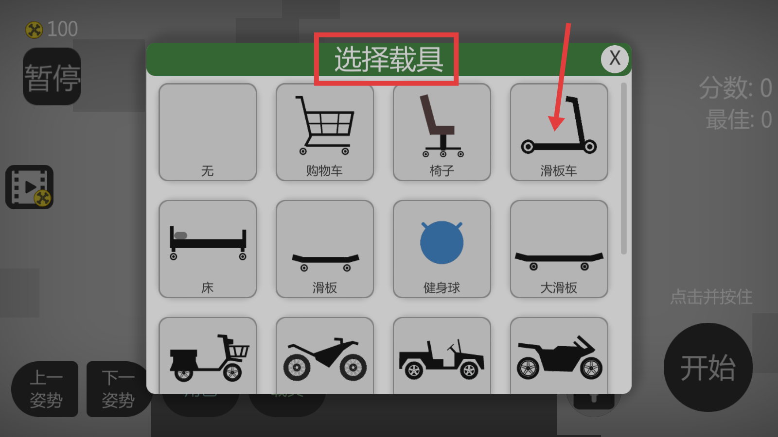 2、在【选择载具】界面,挑选适合的载具,比如选择【滑板车】,以便后续进行操作。