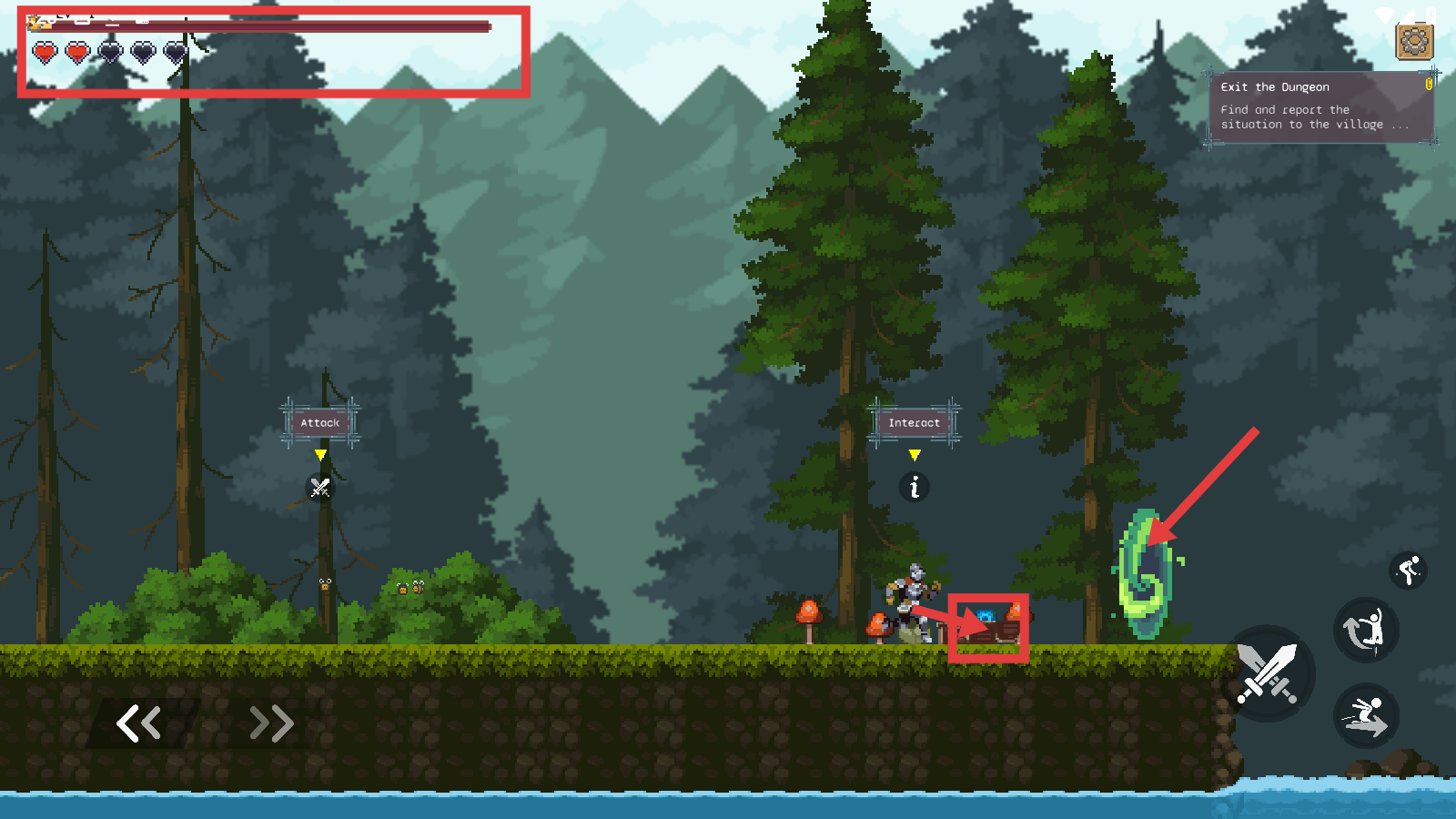 3、探索过程中,关注左上角生命值,遇到宝箱可互动获取资源,靠近绿色传送门准备推进流程。