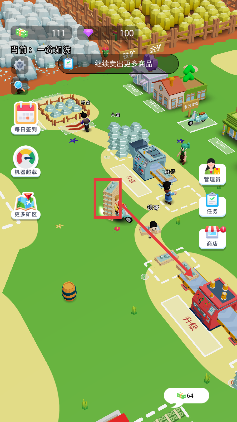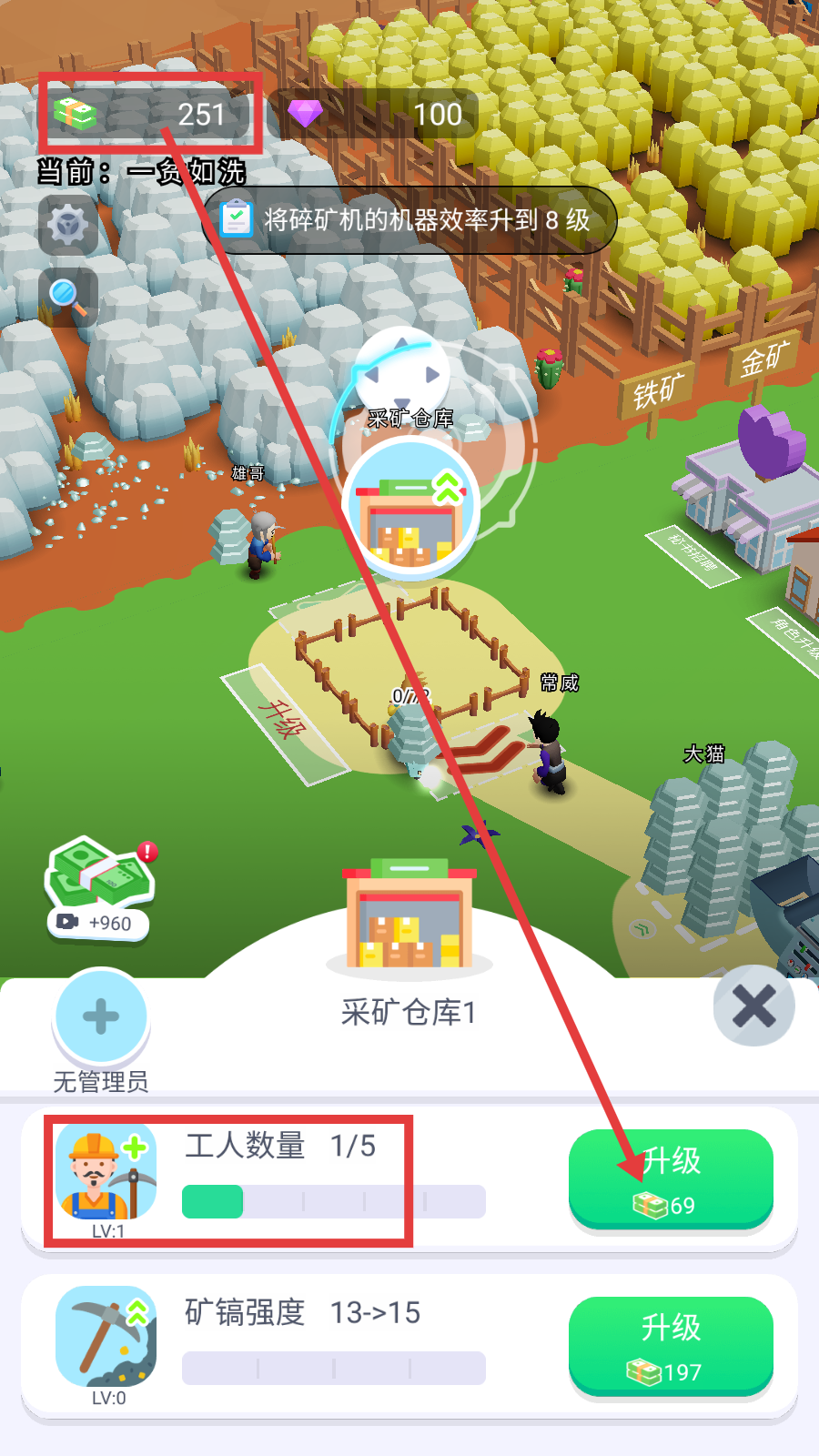 4、使用获取的金币,升级【采矿仓库1】,增加工人数量等属性,提升采矿与运输的效率。