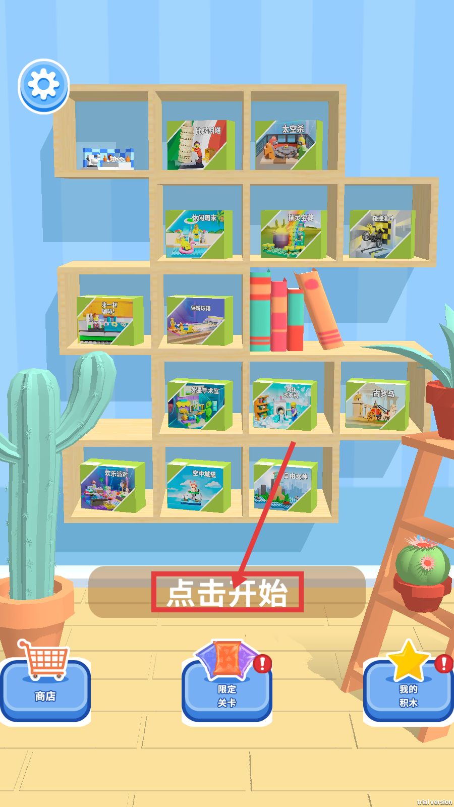 1、进入关卡后,可先查看商店、限定关卡等界面功能,再点击【点击开始】开启游戏。
