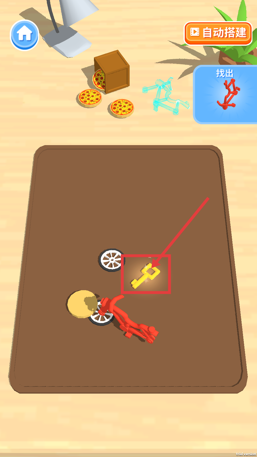 3、完成披萨寻找后,继续根据提示【找出】红色构件,同时留意场景中的黄色钥匙等关键物品。