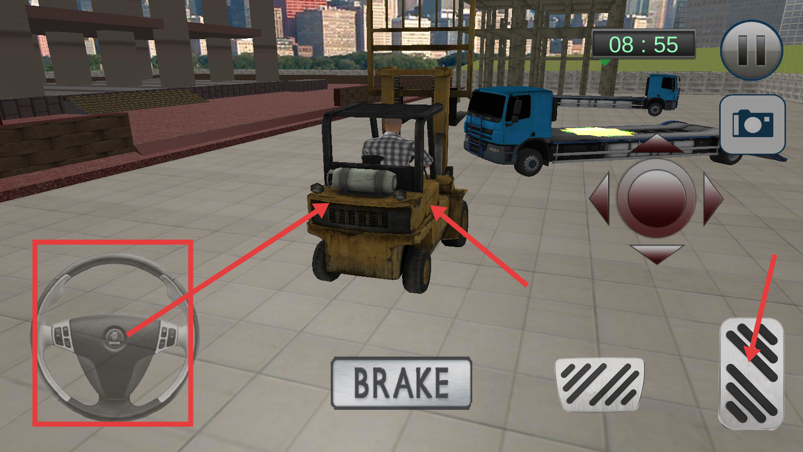 2、进入游戏后,通过左侧方向盘控制叉车方向,右侧踏板控制移动,在场地中操控叉车,同时留意上方的时间限制,朝着蓝色卡车方向行进。