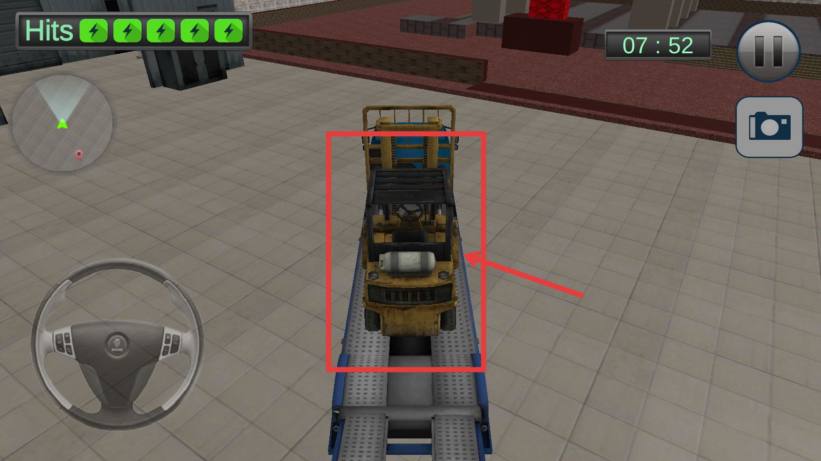 4、成功将叉车驾驶到蓝色卡车上的指定位置后,即可完成装卸任务,同时留意左上角【Hits】的计数情况,尽量保持良好的操作记录。