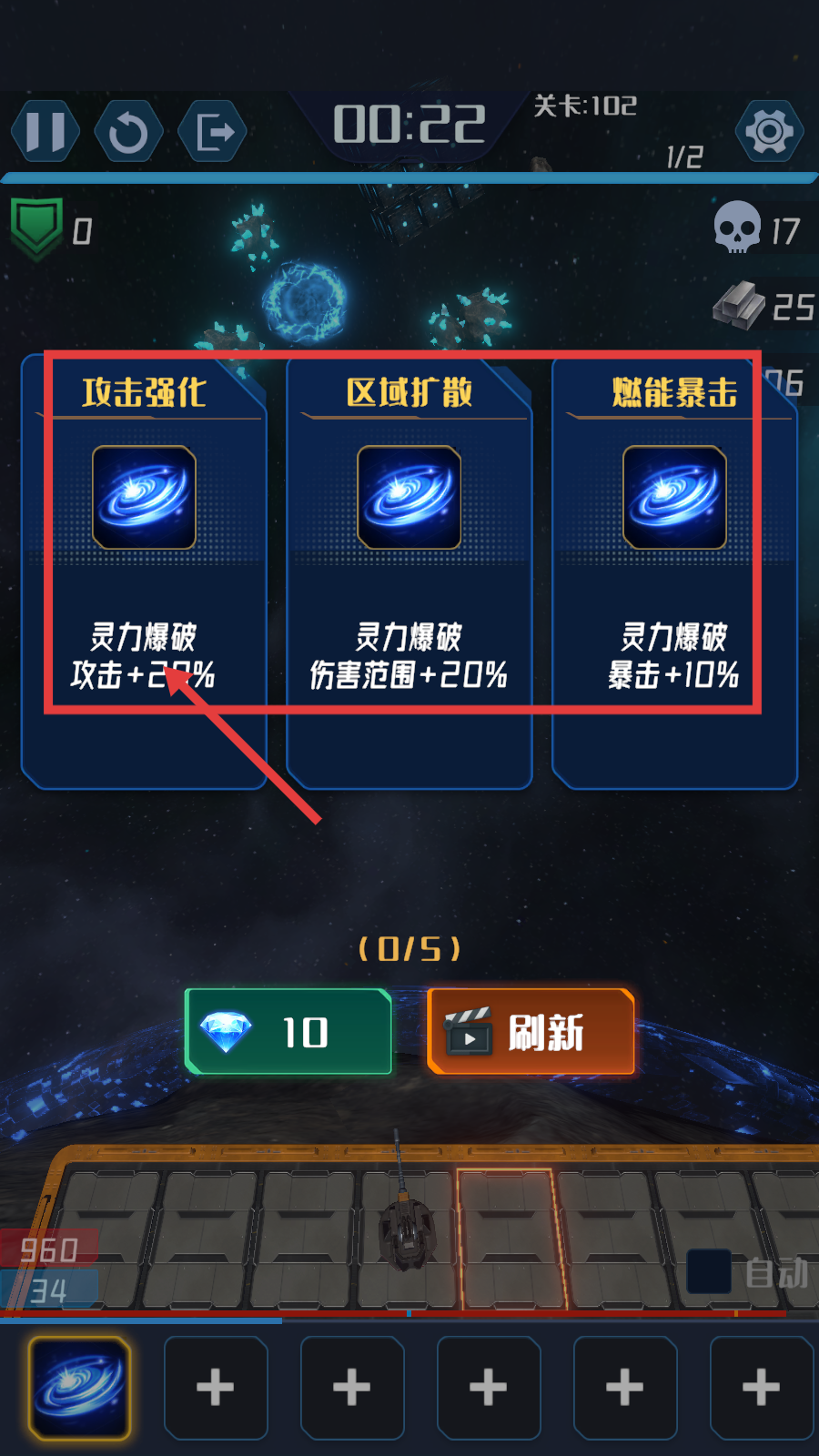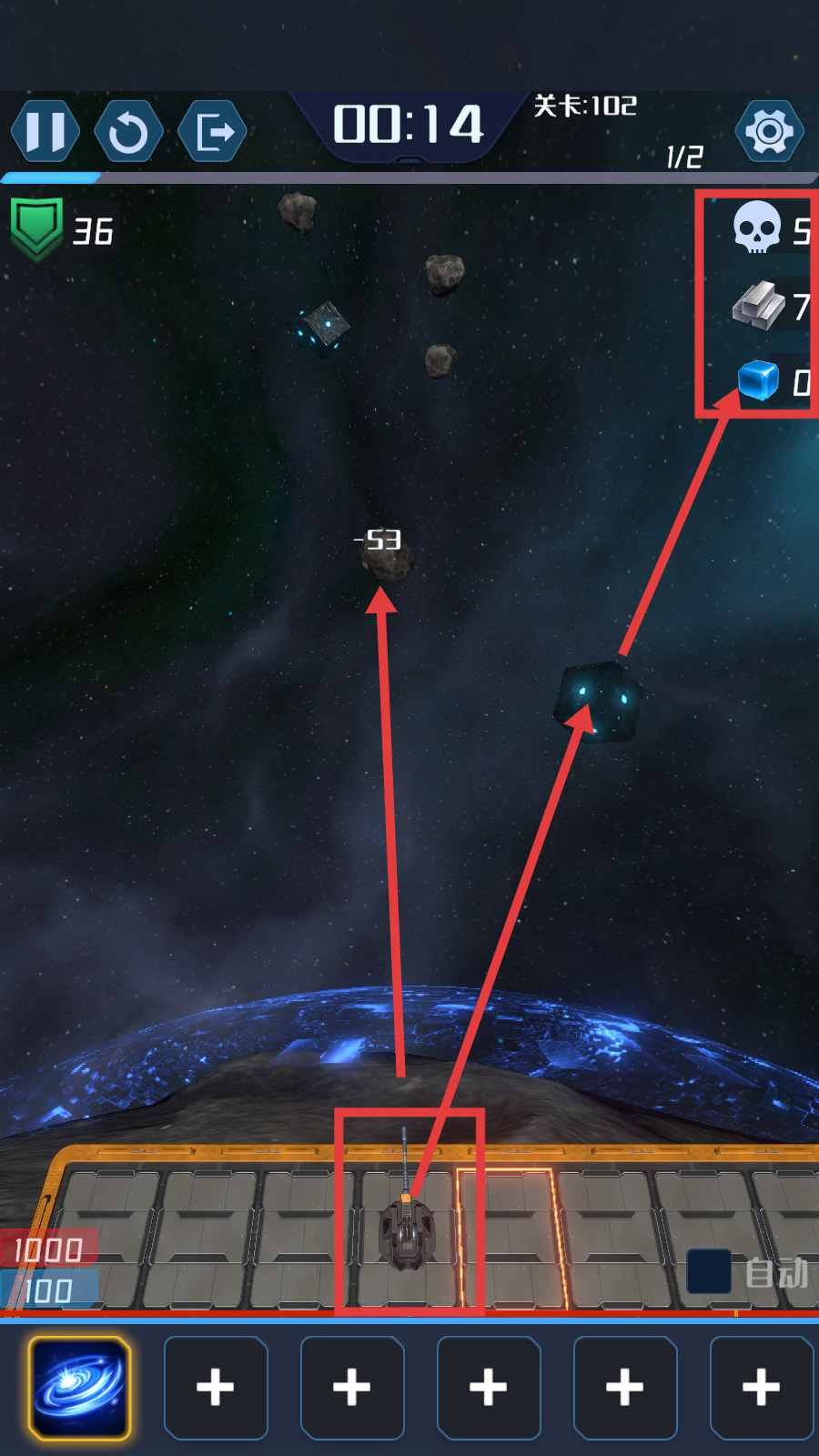 2、关卡102战斗时,操控武器攻击陨石与带蓝光的敌方单位,同时关注右上角骷髅头、金属、蓝色方块的获取进度。