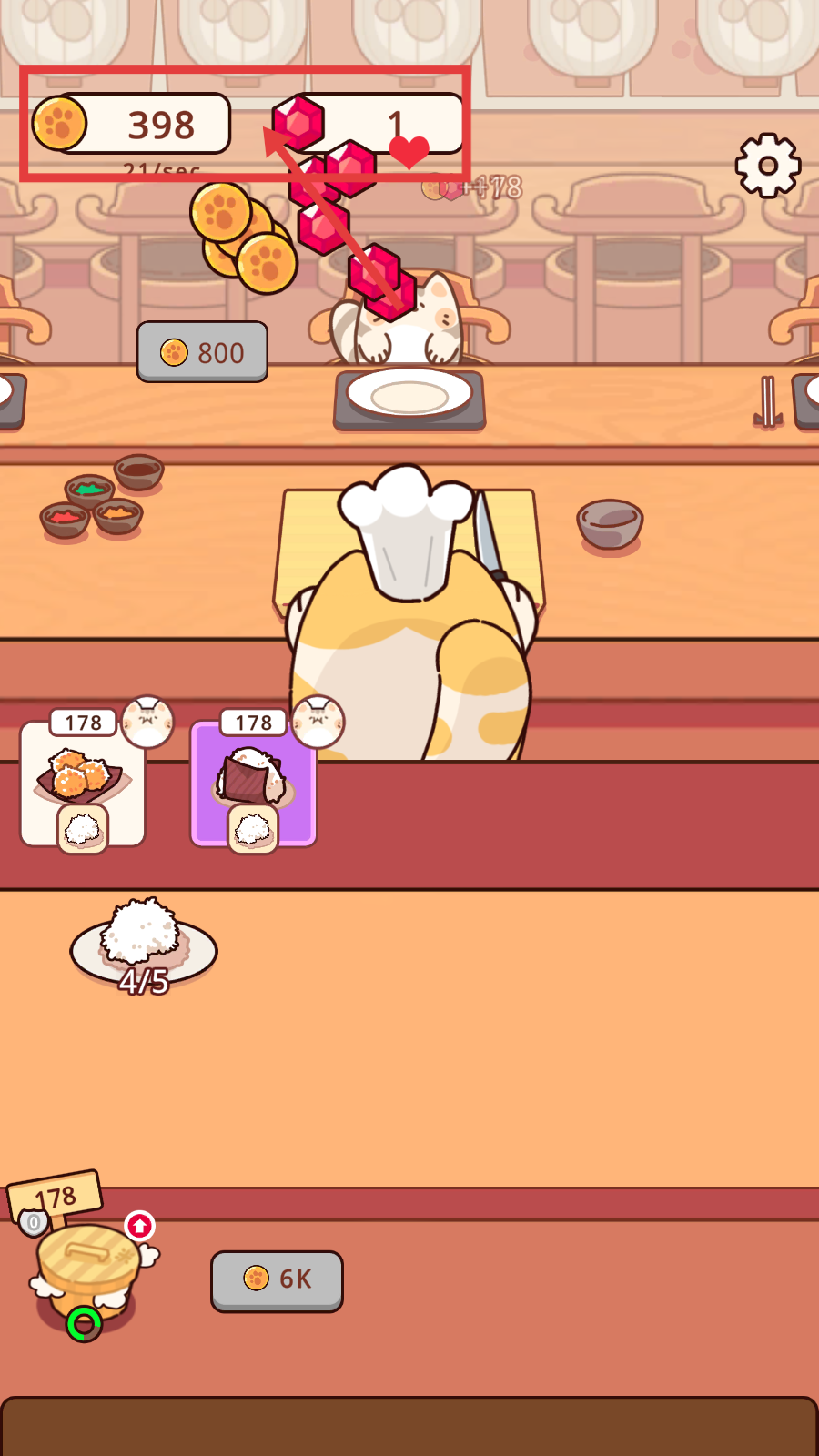 3、顾客用餐结束后,会掉落猫爪币与红宝石等奖励,及时收集这些资源用于后续升级。