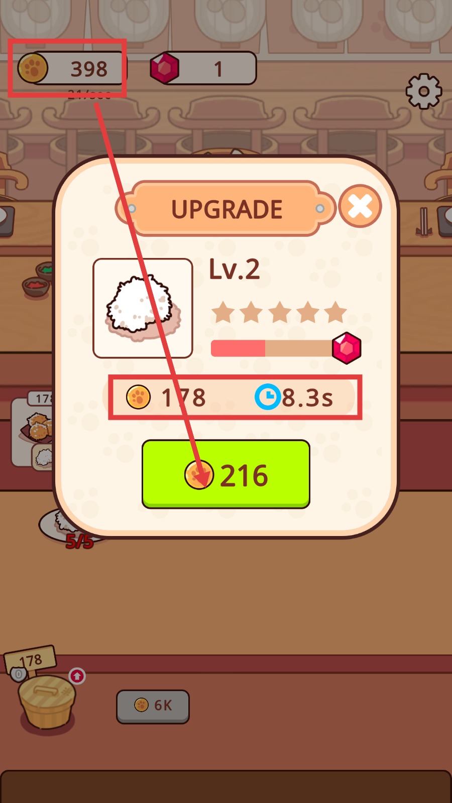 4、积累足够猫爪币后,消耗【216】猫爪币升级米饭,可提升其产出收益与制作效率。