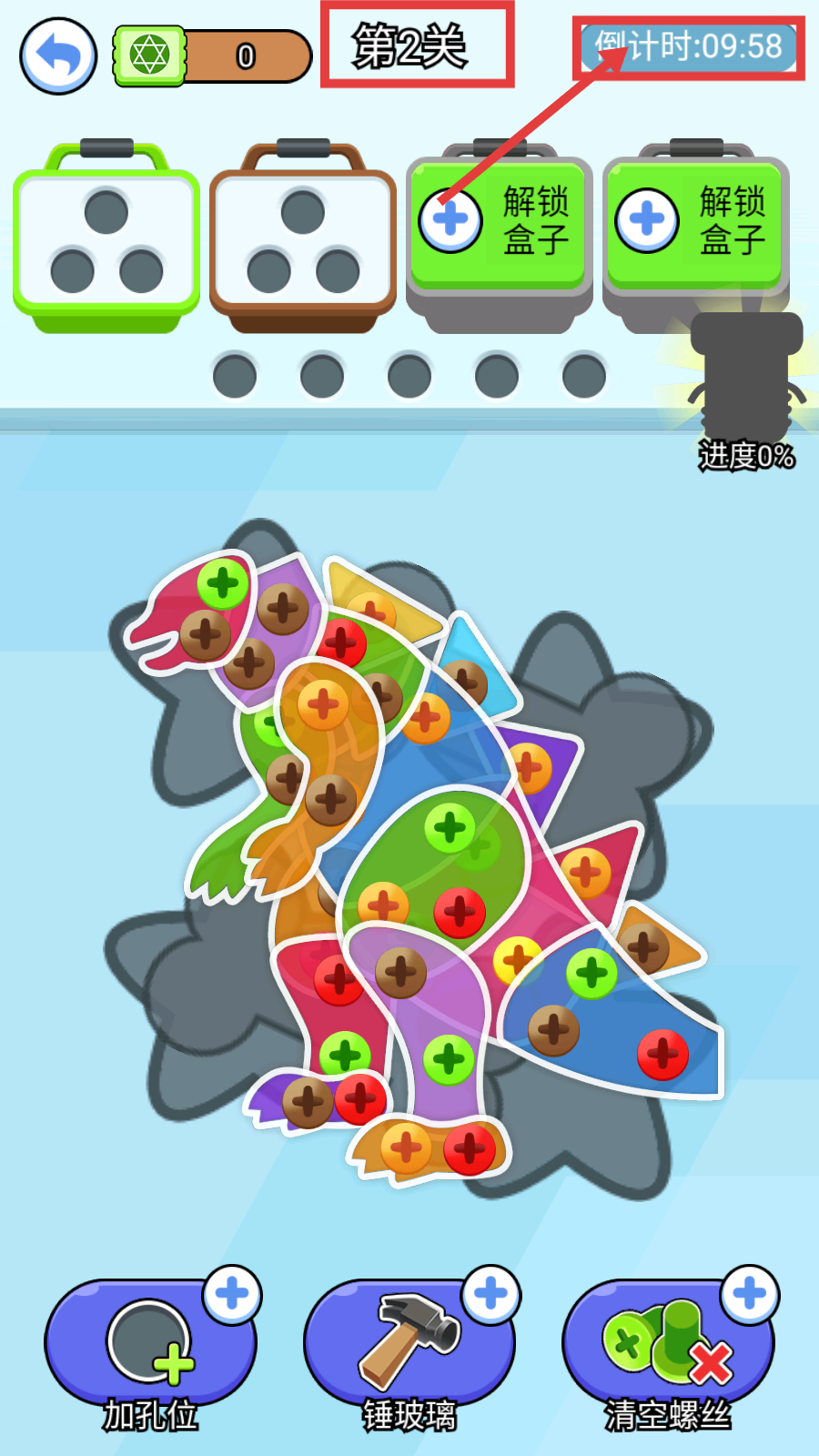 1、进入【第2关】后,留意【倒计时-09:58】,观察恐龙形状图案上的各色螺丝,准备按颜色分类收纳。