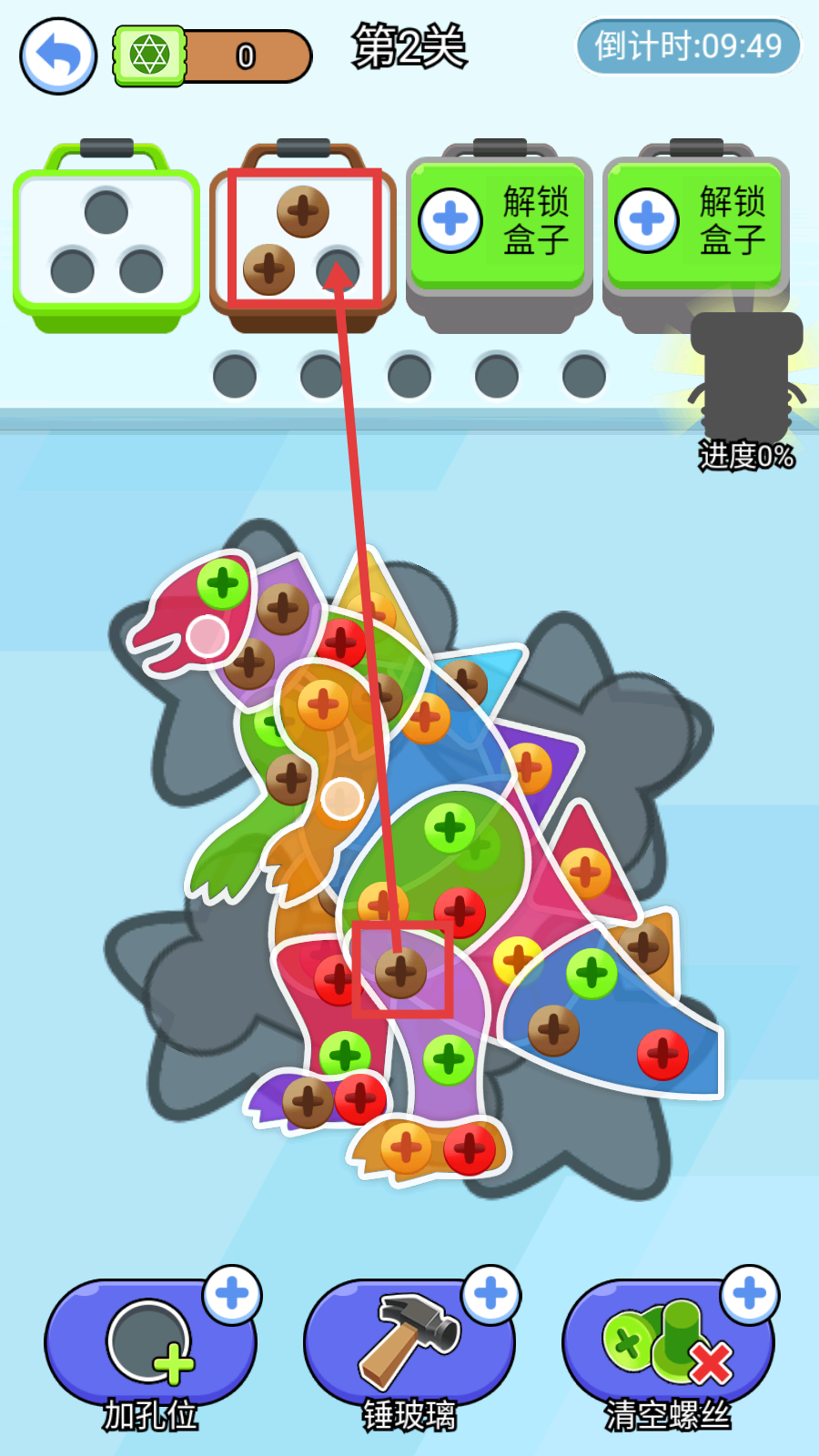 2、点击恐龙图案上的棕色螺丝,将其放入上方对应棕色盒子的孔位中,逐步清空同色螺丝。