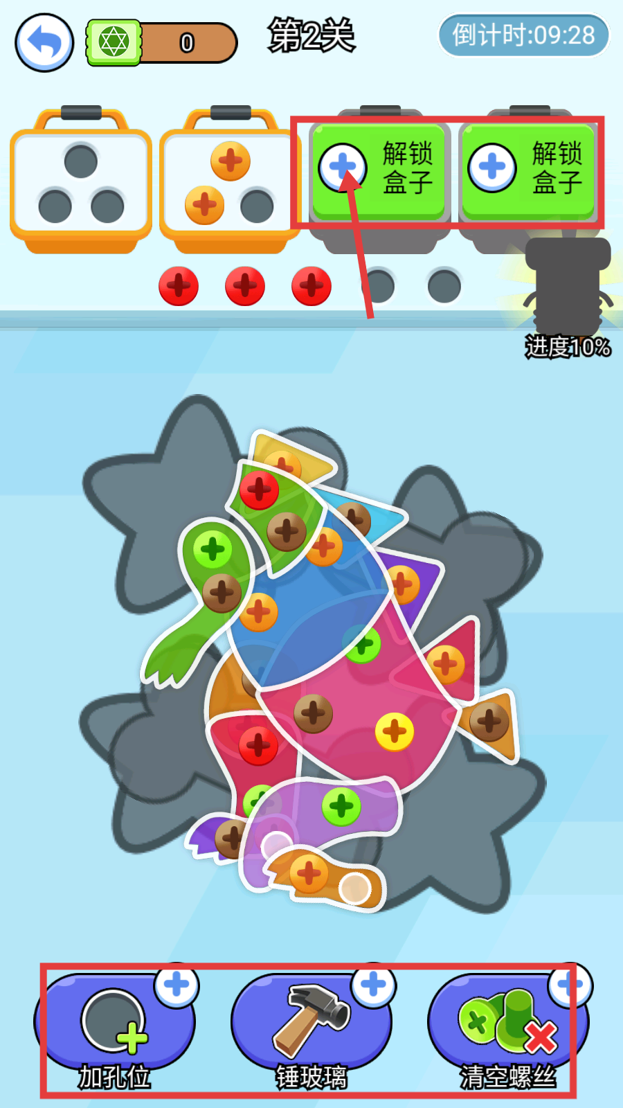 3、当进度推进后,点击【解锁盒子】拓展收纳空间,灵活运用【加孔位】【锤玻璃】【清空螺丝】工具辅助操作。