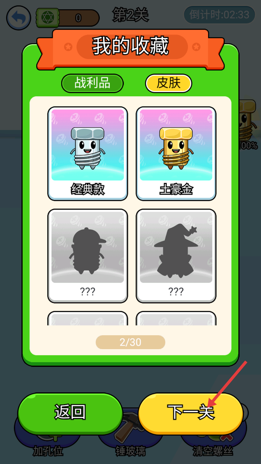 4、通关后可查看【我的收藏】中“经典款”“土豪金”等螺丝皮肤,然后点击【下一关】继续挑战新关卡。