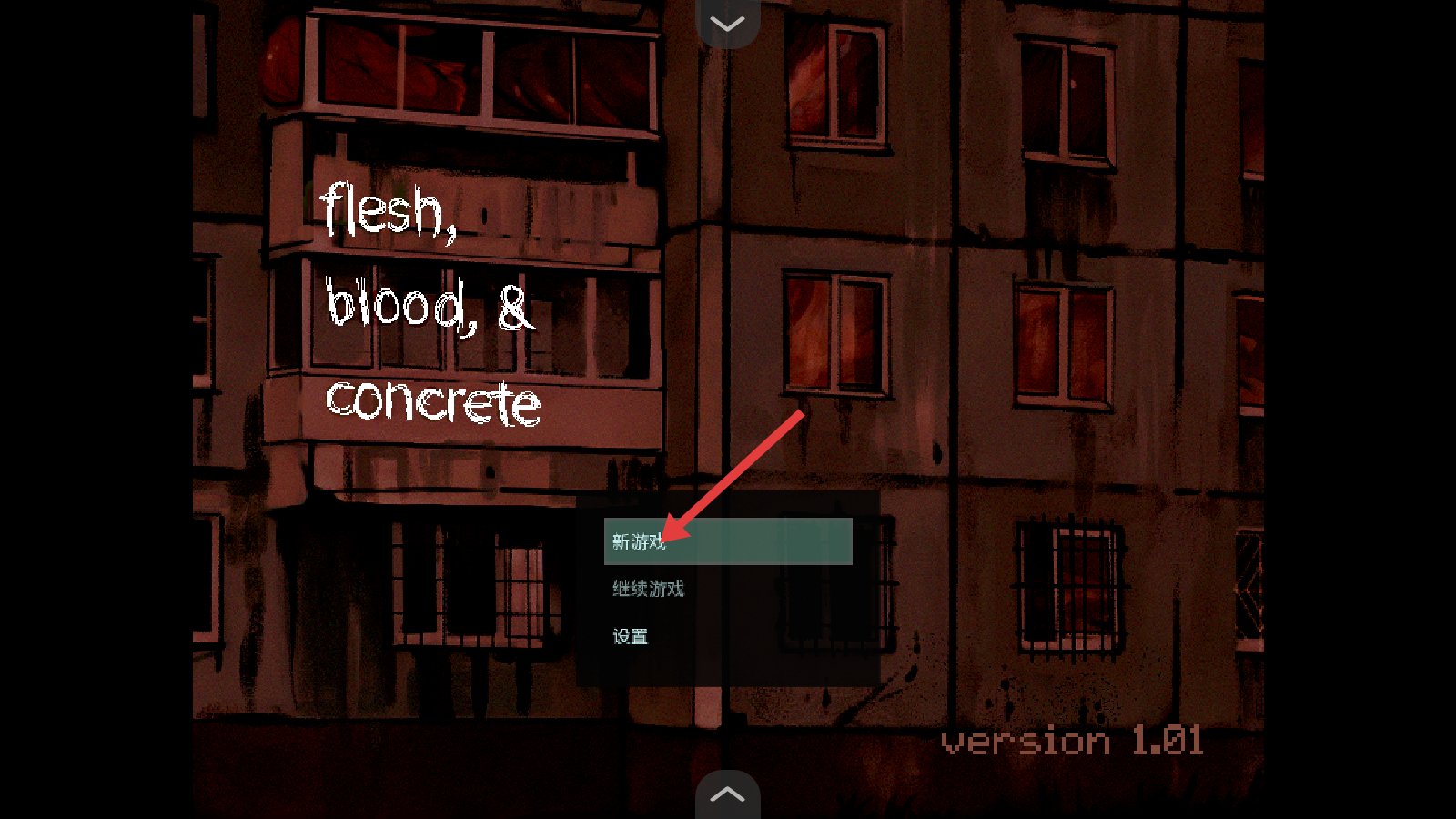 1、点击【新游戏】,进入《flesh,-blood,-&-concrete》开启冒险,准备探索场景并与各类元素互动。