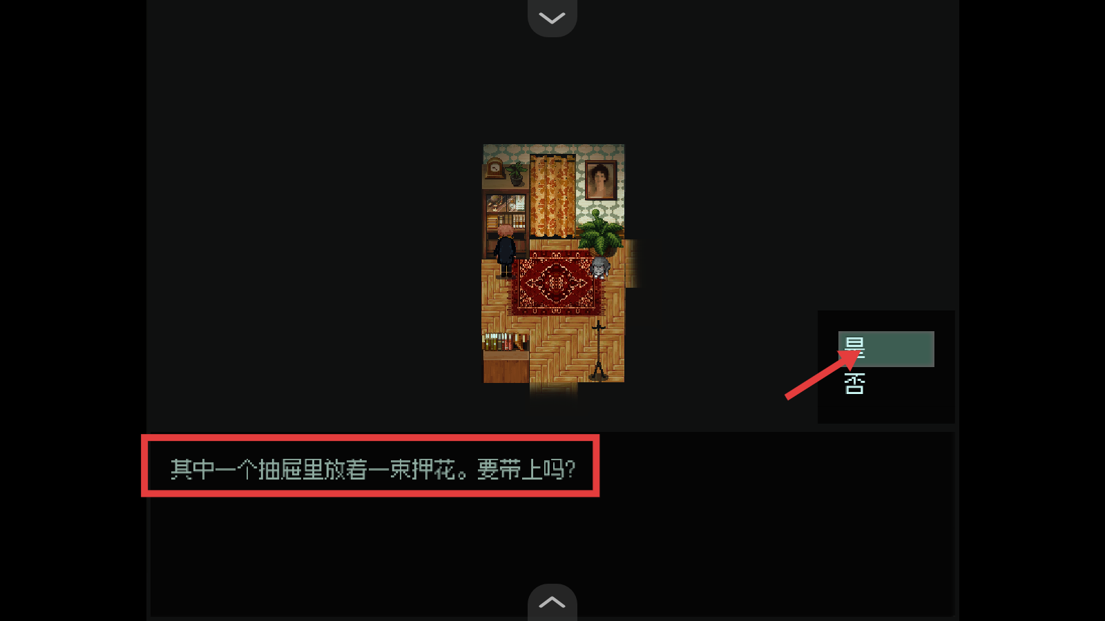 2、在抽屉中发现【押花】时,选择【是】将其带上,该物品可能对后续剧情或收集有帮助。