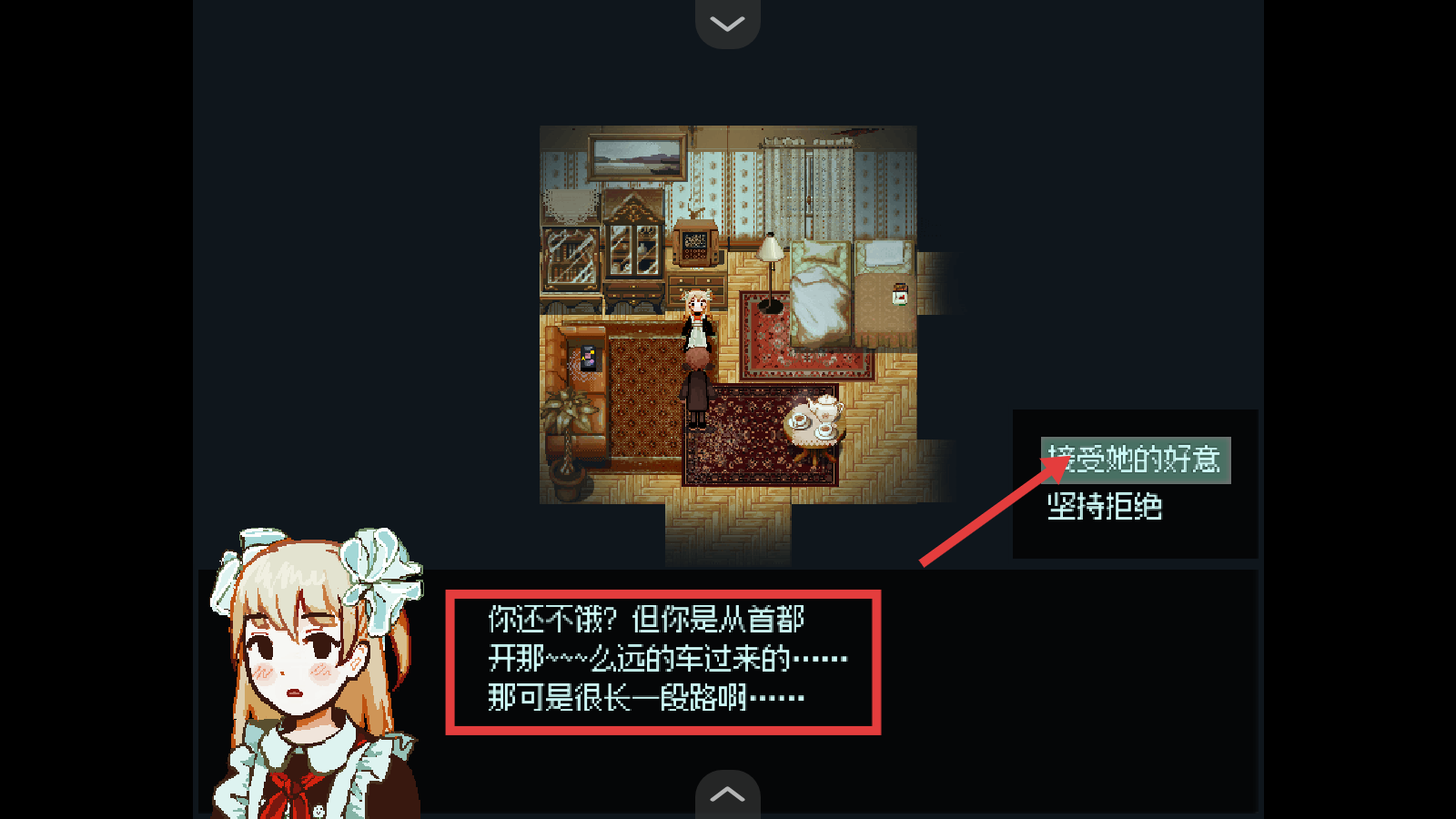 4、当NPC因你长途跋涉而发出邀请时,选择【接受她的好意】,触发相关剧情或获得助力,丰富游戏体验。