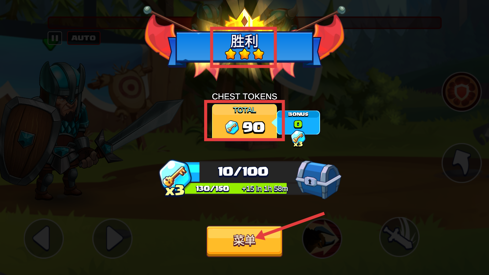 4、战斗胜利后,获取【90】个宝箱代币等奖励,点击【菜单】按钮,可查看或使用奖励,准备挑战后续关卡。