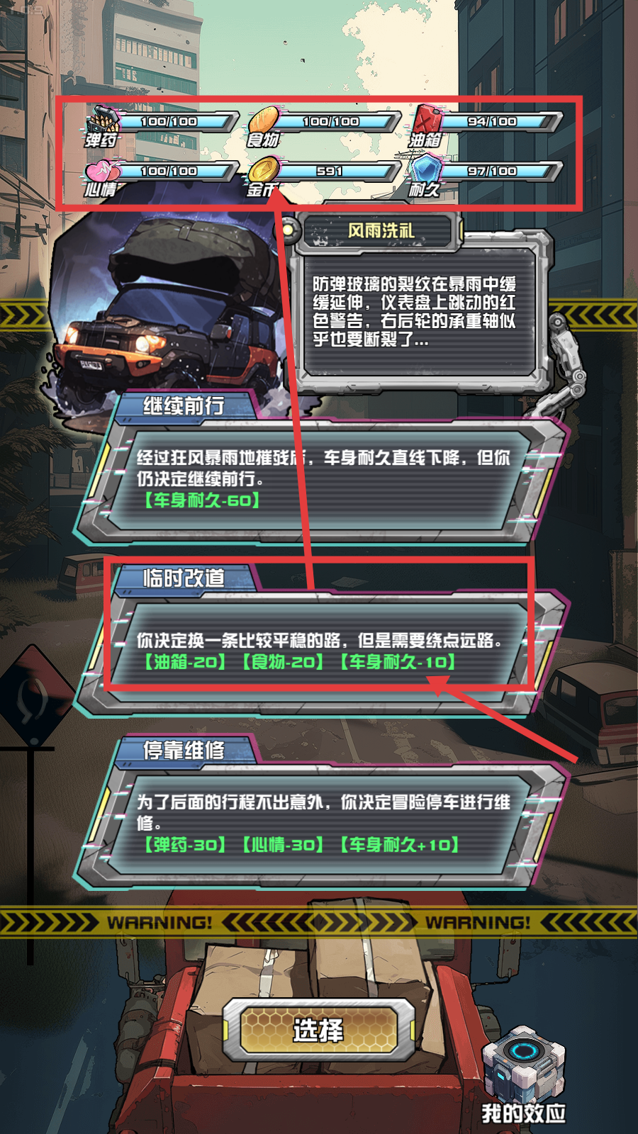 2、遇到“风雨洗礼”事件时,根据资源情况选选项,可选【临时改道】,需承担【油箱-20】【食材-20】【车身耐久-10】的消耗。