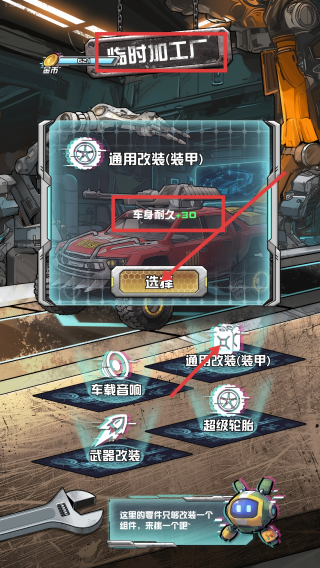 3、进入【临时加工厂】后,选择【通用改装(装甲)】,点击【选择】可提升【车身耐久+30】,强化车辆以便应对后续挑战。