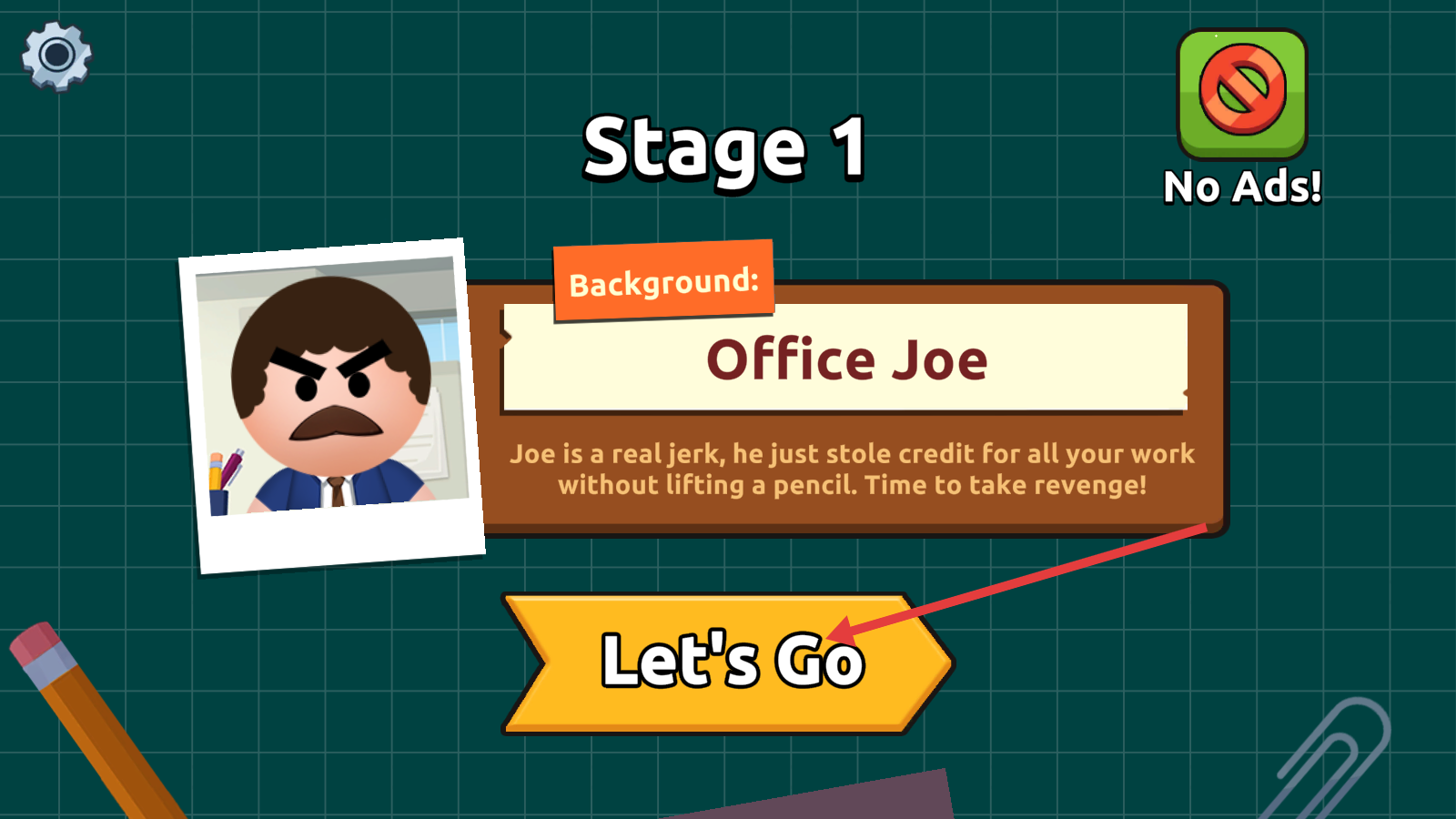 1、点击【Let'sGo】进入Stage1,背景为【OfficeJoe】,他窃取你工作成果,开启复仇行动。