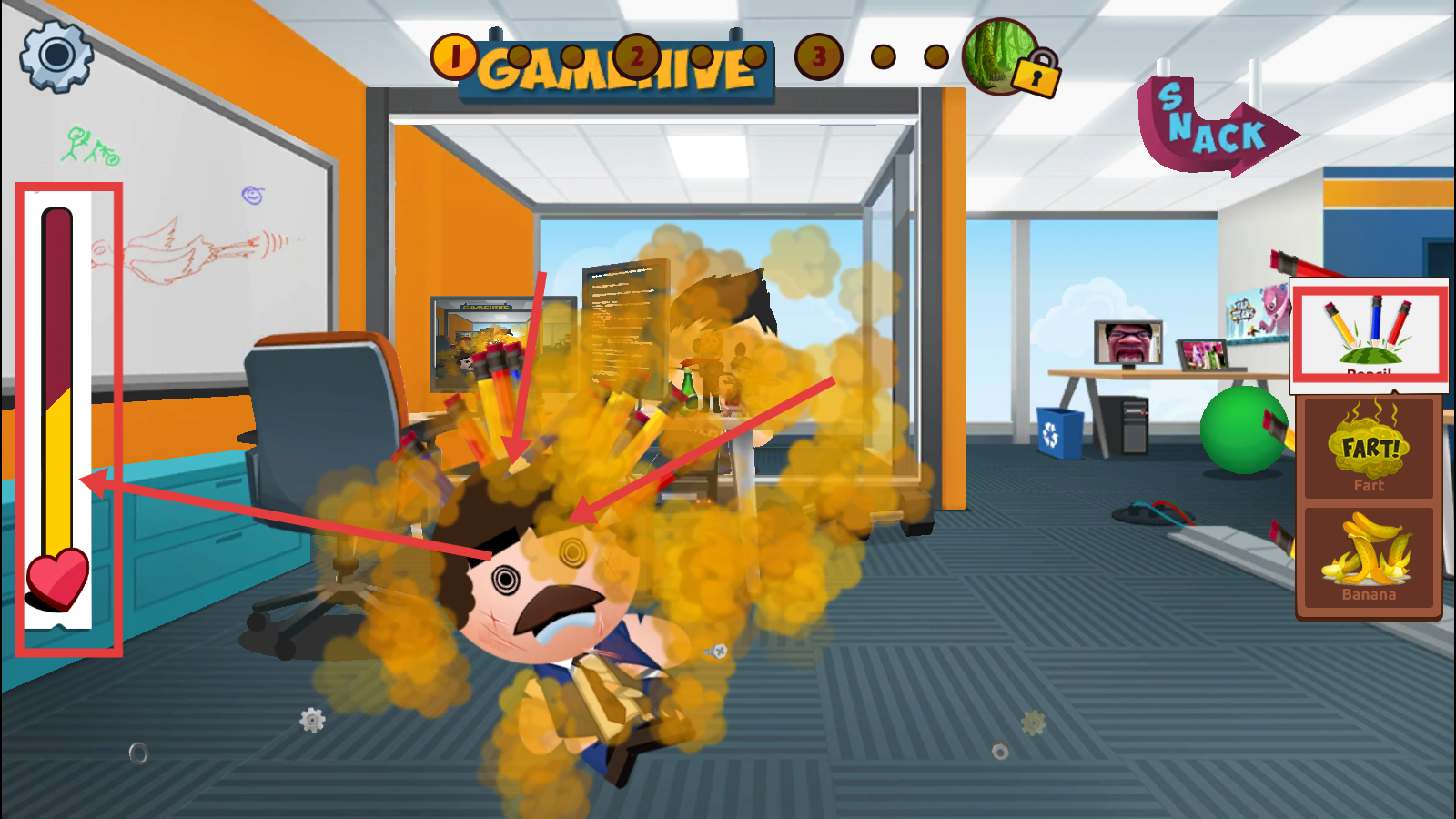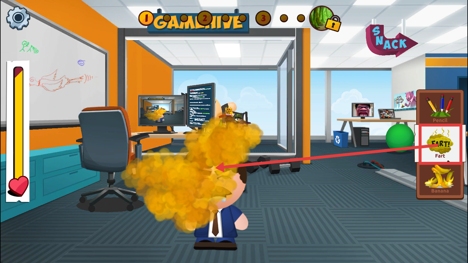 2、在办公室场景,选择右侧【Fart】道具,对目标使用,释放黄色烟雾,开展整蛊复仇。