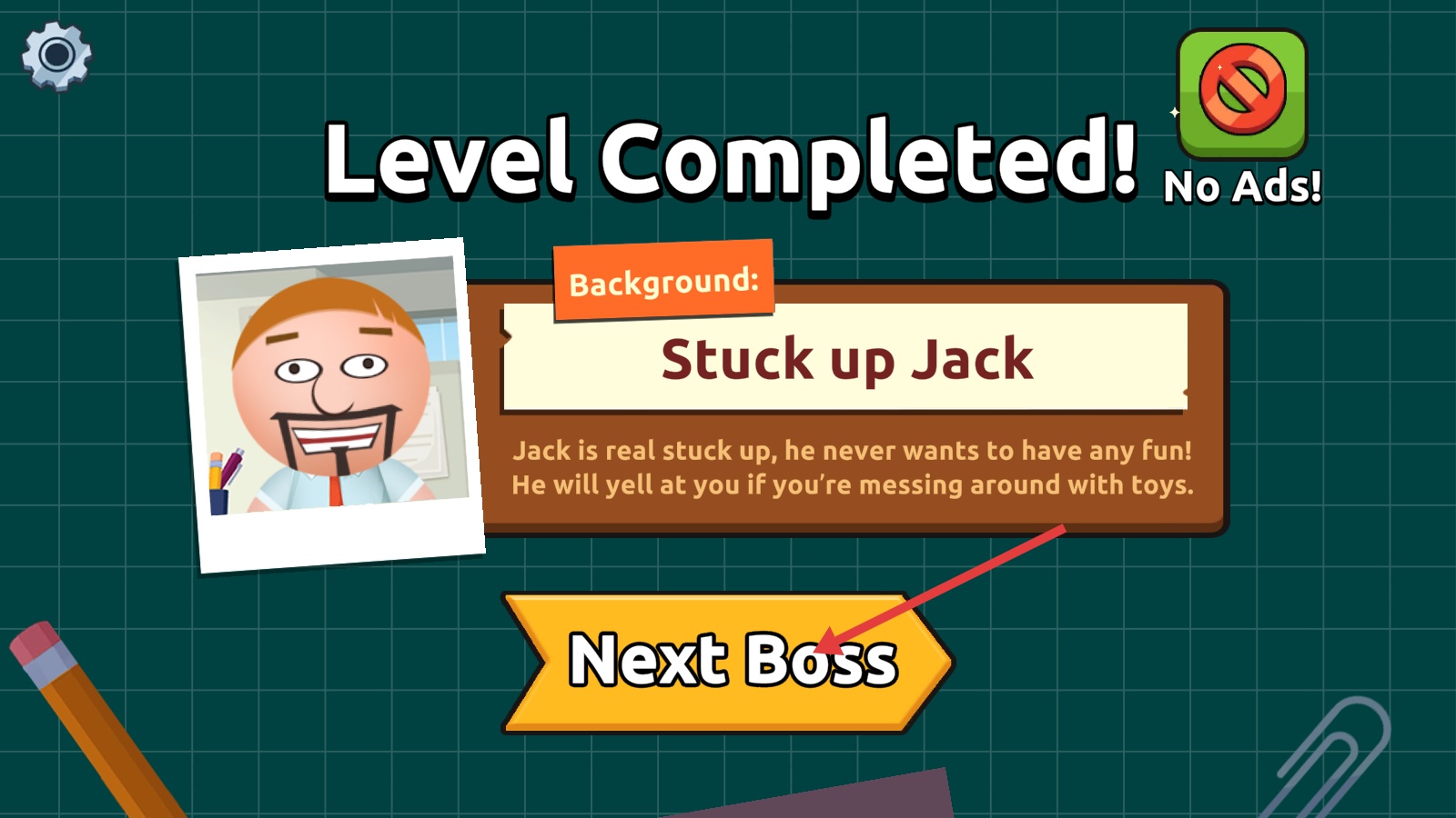 4、关卡完成后,点击【NextBoss】,准备挑战下一个目标【StuckupJack】,应对他因玩闹而吼叫的情况。