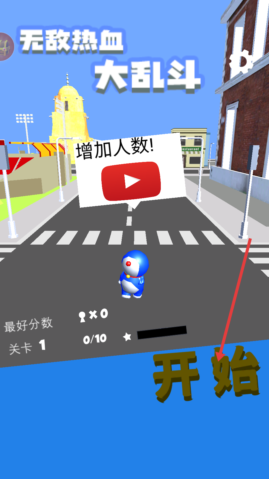 1、在《无敌热血大乱斗》【关卡1】界面,点击“开始”按钮,进入街道场景的大乱斗挑战。
