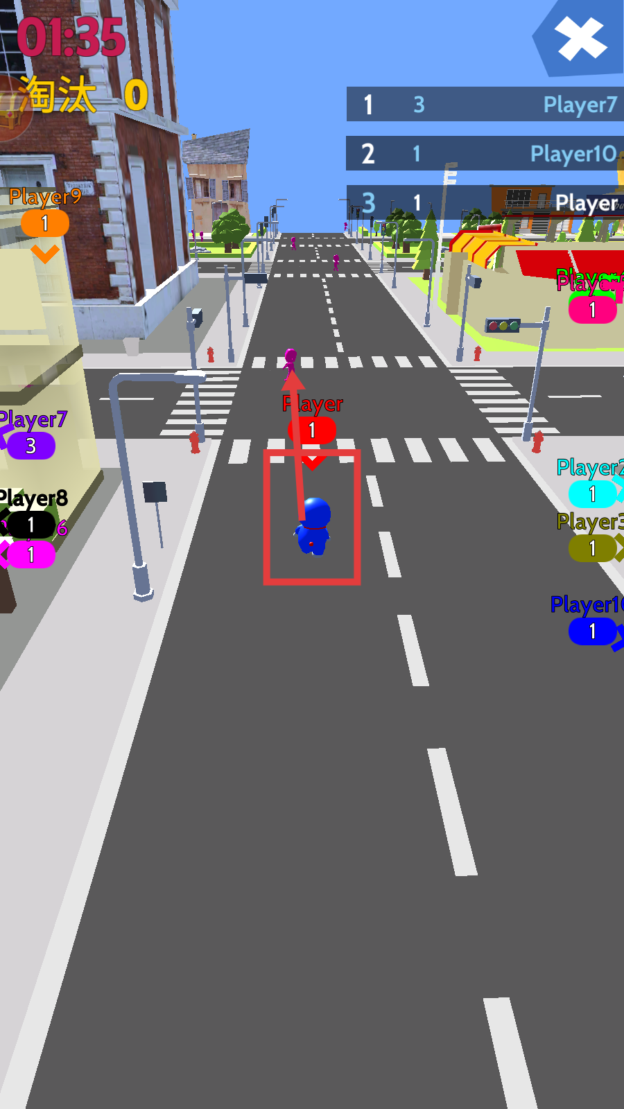 2、操控角色在街道移动,留意“淘汰0”的计数,同时观察周围其他玩家(如Player7、Player10等)的位置与数量。