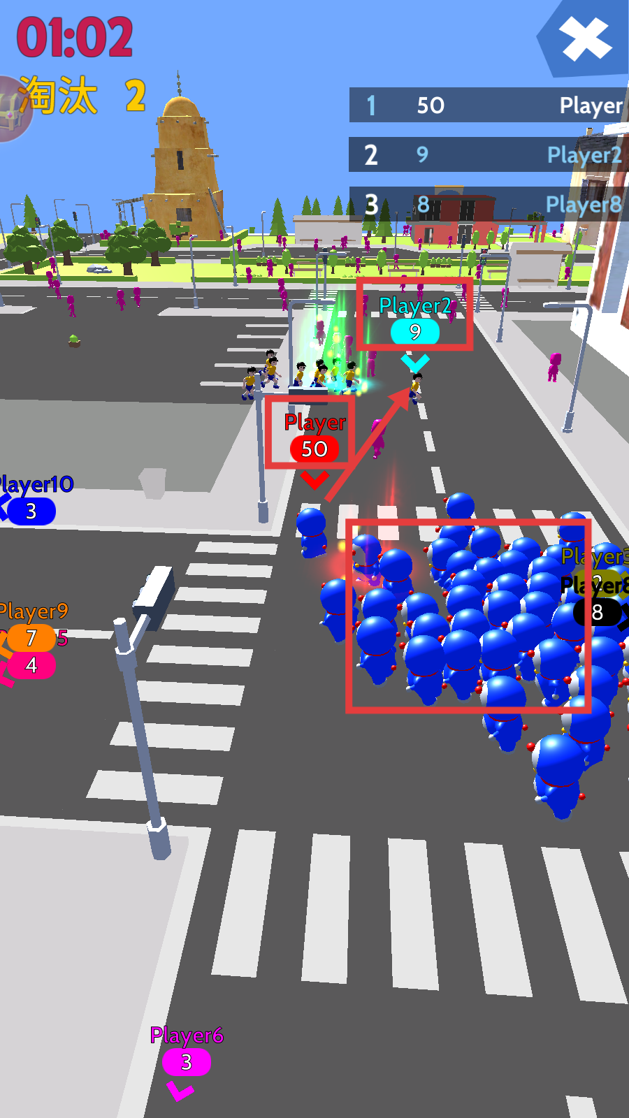 3、集结蓝色角色形成群体,与其他玩家(如Player2)的队伍对抗,通过壮大自身数量提升淘汰对手的能力。