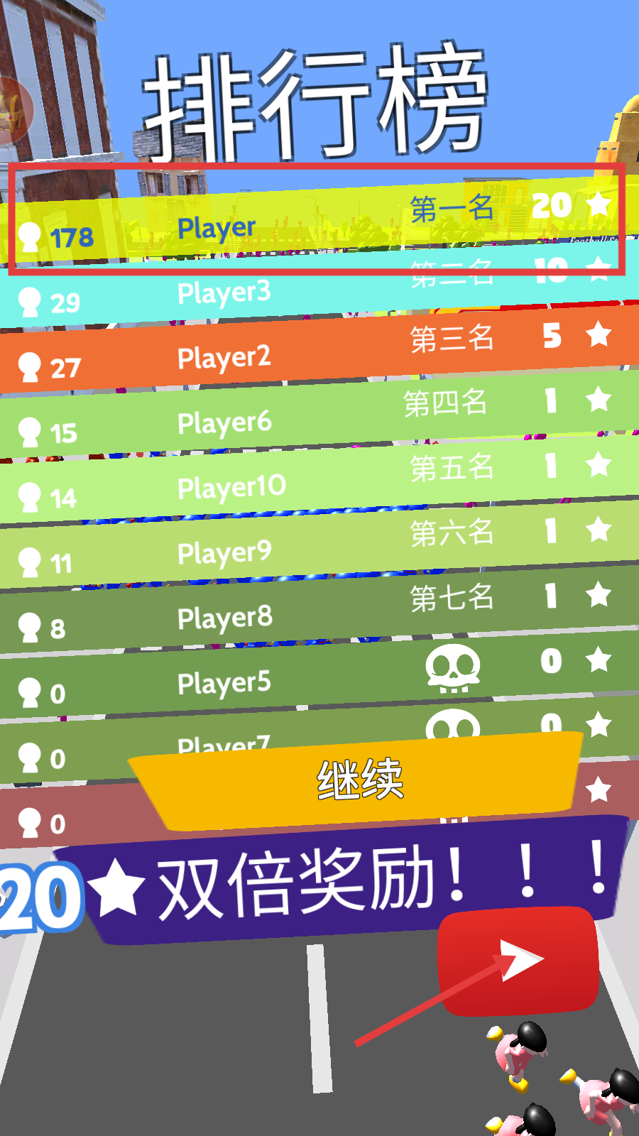 4、对局结束后,力争登上“排行榜”第一名,像图中“Player”那样获取高星奖励,之后点击“继续”可开启后续挑战。