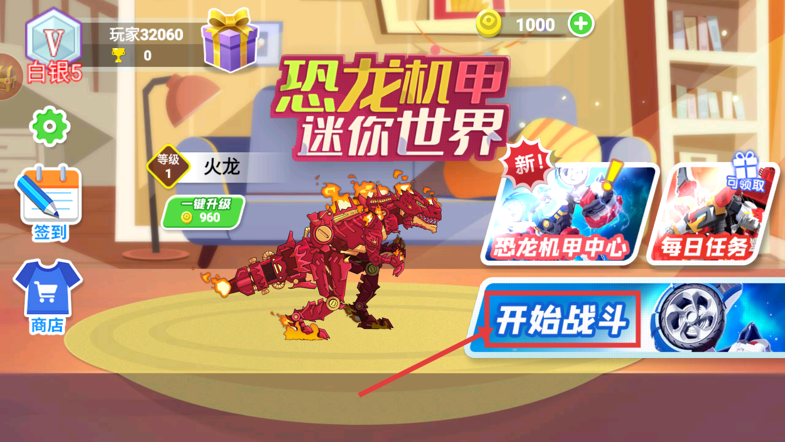 1、在《恐龙机甲迷你世界》主界面,操控【等级1-火龙】机甲,点击【开始战斗】按钮,进入对战关卡。
