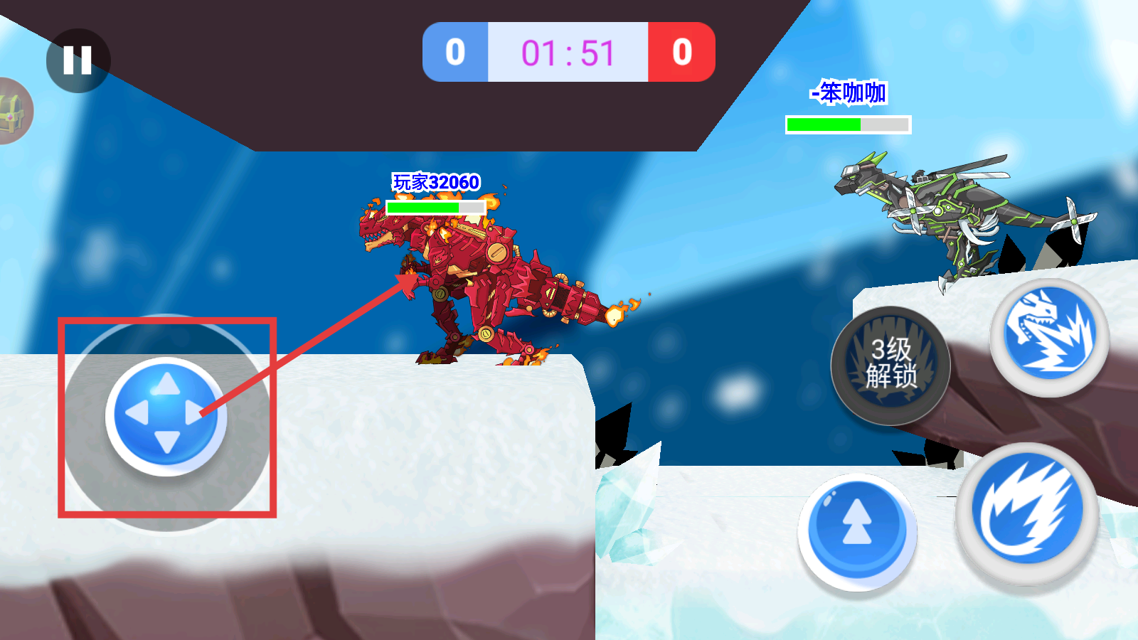 2、战斗时,用左侧方向按钮移动机甲,在冰雪场景中调整位置,准备与对手【-笨咖咖】的机甲交战。