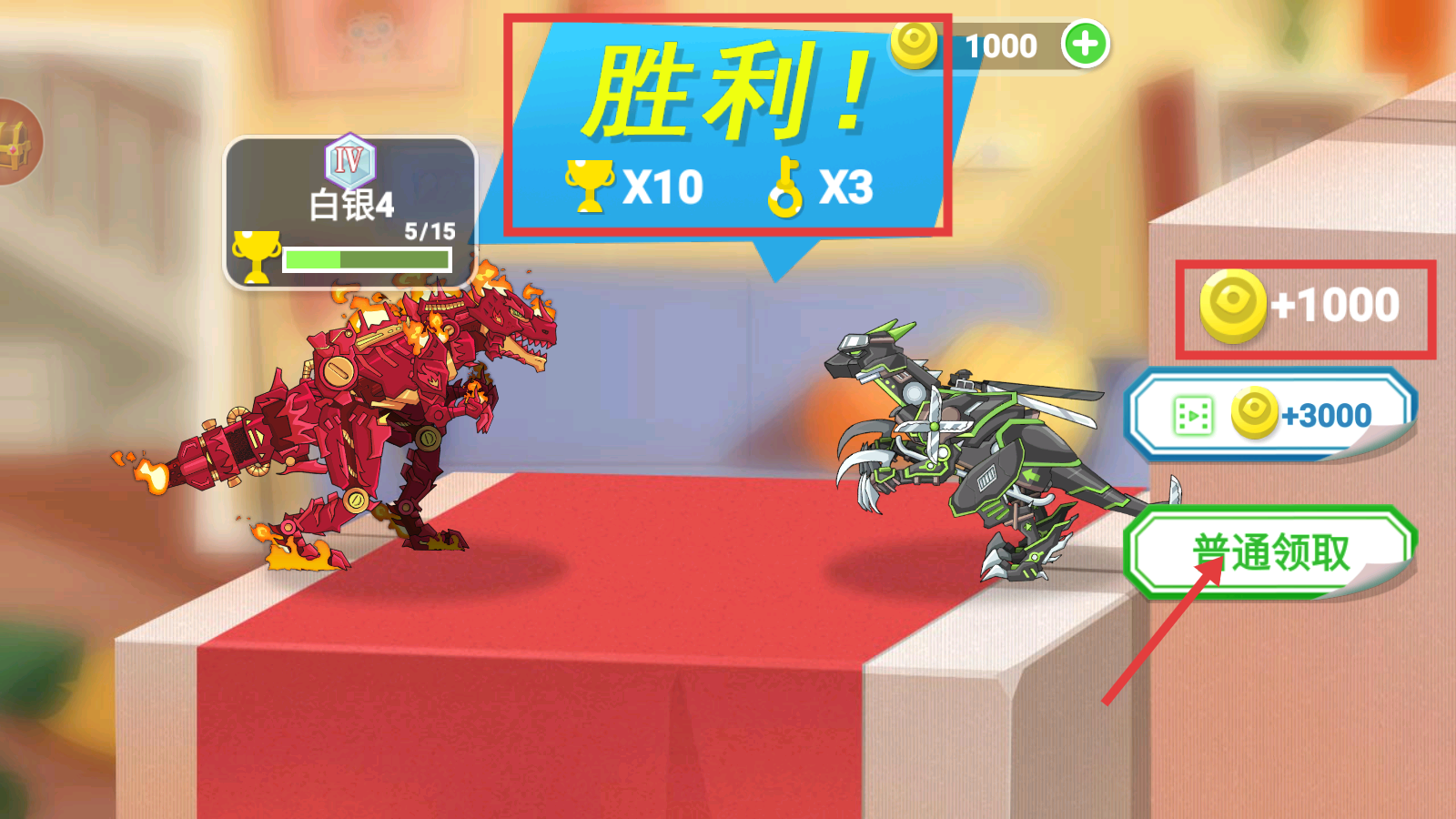 4、战斗胜利后,界面显示【胜利!】,可点击【普通领取】获取【金币+1000】等奖励,提升机甲等级或解锁新机甲。