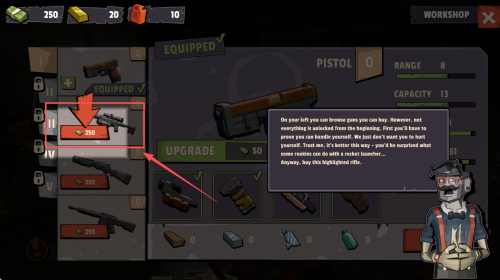 2、如何购买或升级武器?在工作坊界面,选择想要购买或升级的武器,点击“UPGRADE”进行升级,或点击“EQUIP”装备武器。