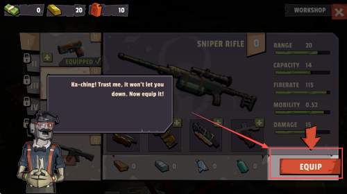 3、如何装备武器?在工作坊界面选择好武器后,点击“EQUIP”按钮进行装备。