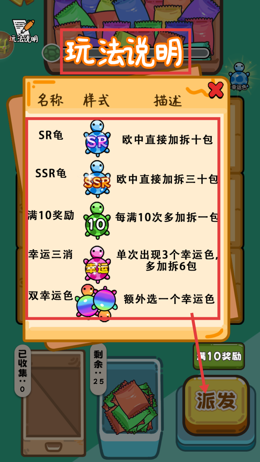 3、运用【许愿】【对对碰】等玩法,拆出幸运色触发加1包,同色乌龟也能加1包,助力获取更多拆包次数。