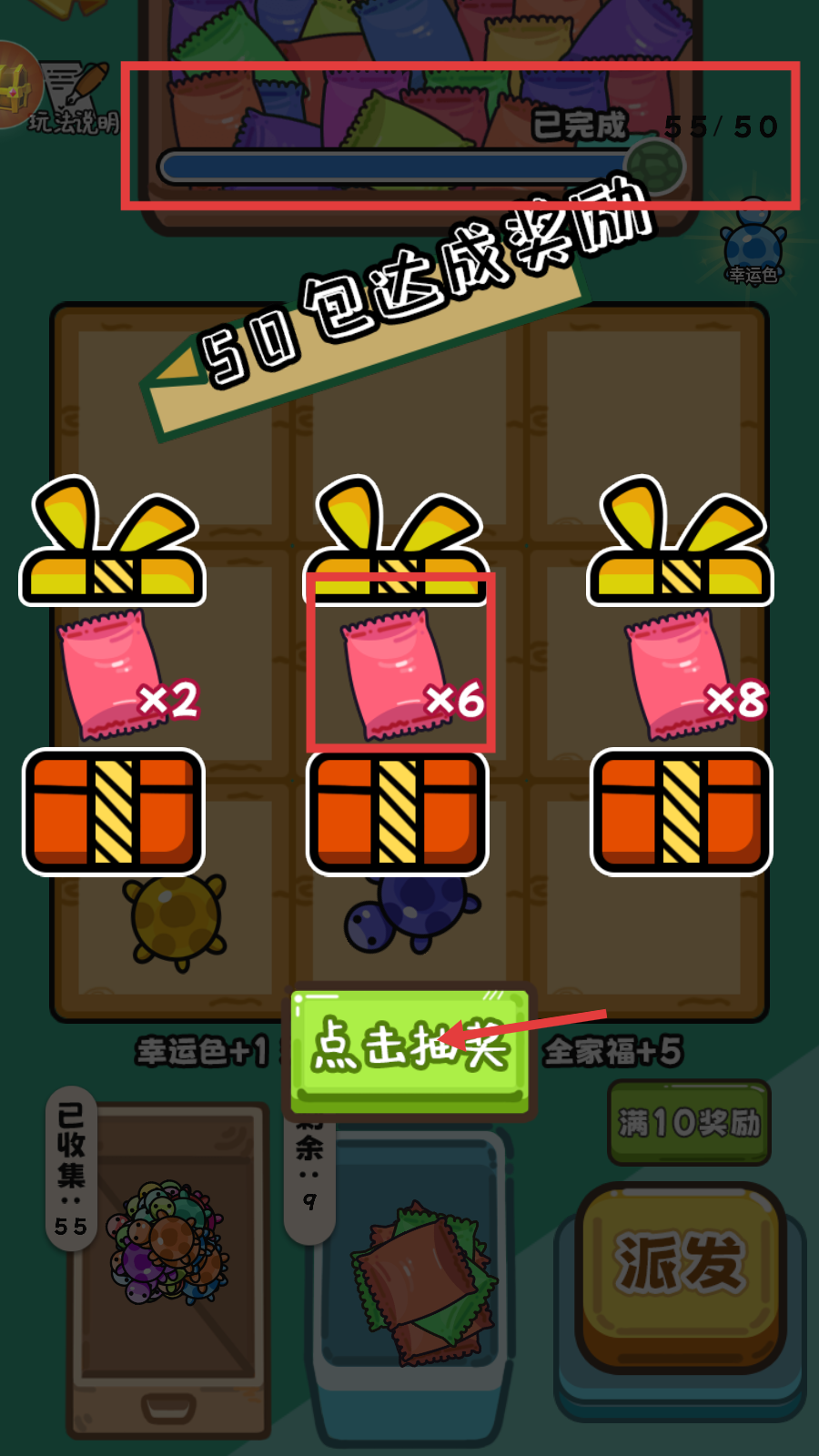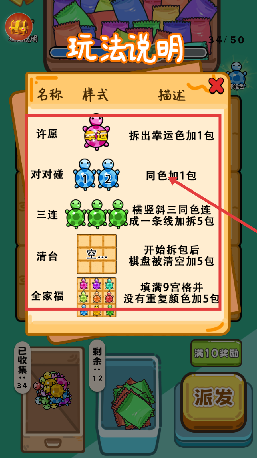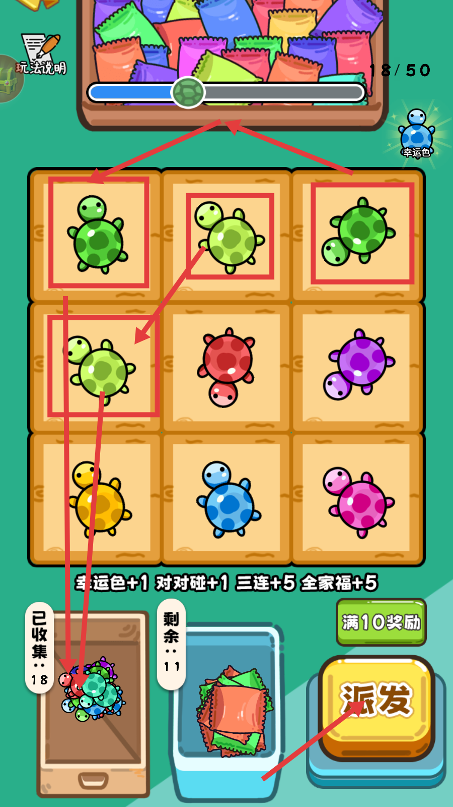 2、观察棋盘上乌龟的分布,通过消除同色乌龟来推进【18/50】的进度,收集后记得点击【派发】。