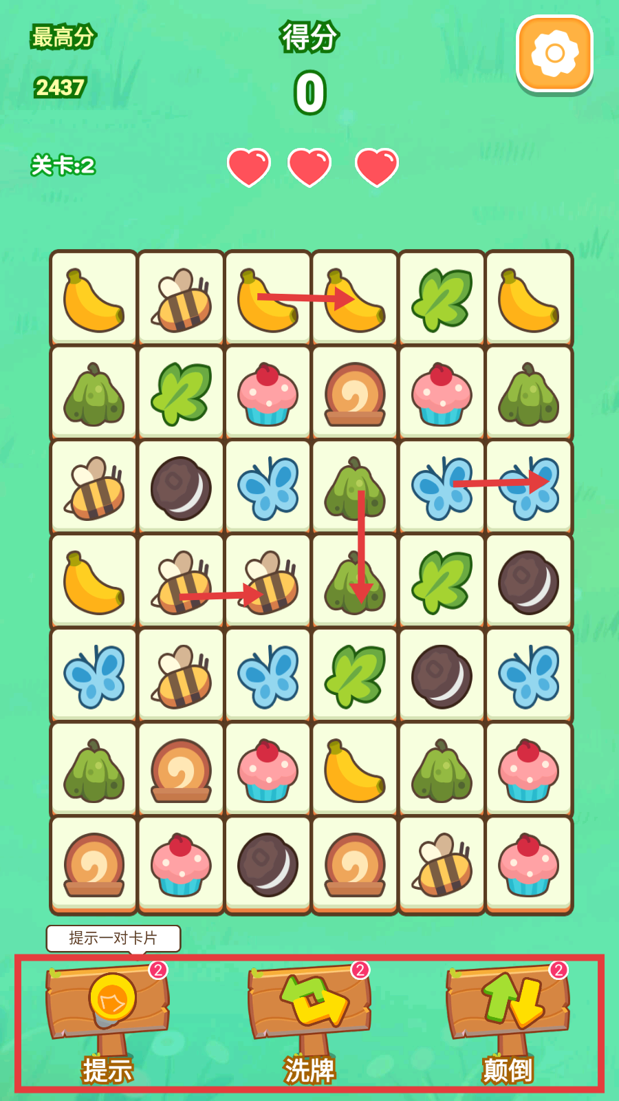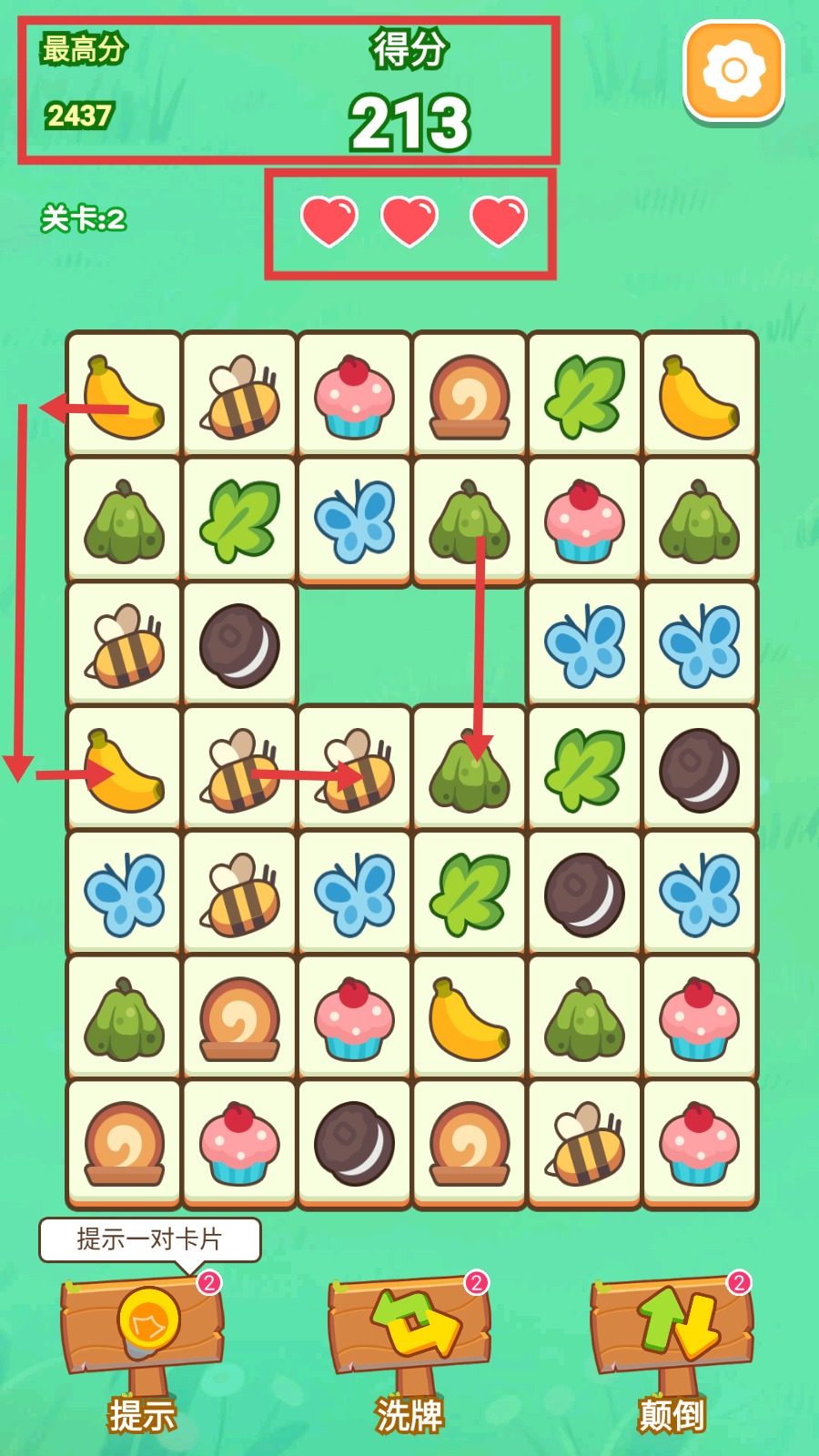 3、配对过程中,关注上方的【得分】数值变化,同时留意【爱心】数量,维持生命值从而持续进行游戏。