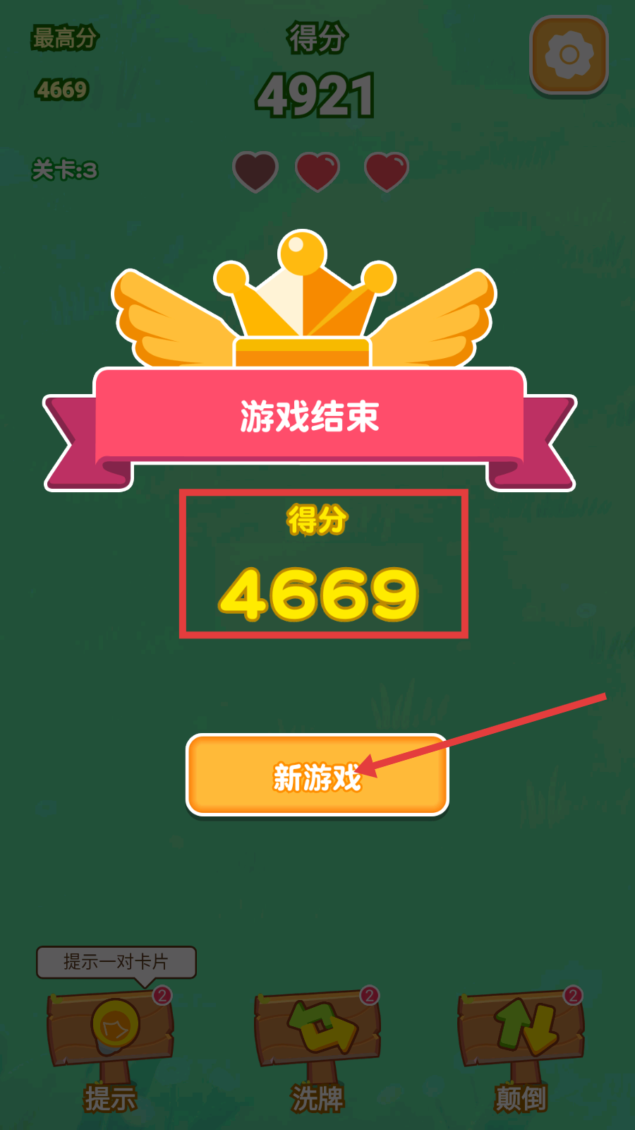 2、在关卡内,善用底部的【提示】【洗牌】【颠倒】功能,帮助寻找相同图案的卡片来进行配对,以此积累得分。