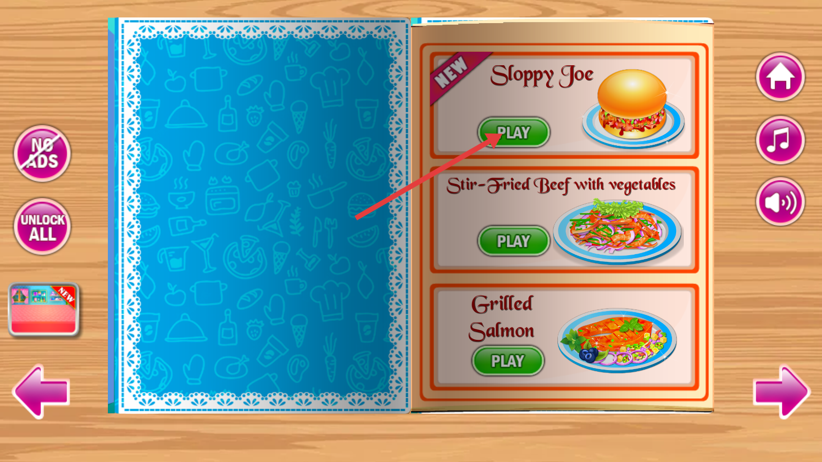 1、在菜谱界面,选择带有【NEW】标识的【SloppyJoe】,点击其下方的【PLAY】按钮,开启该菜品的制作。