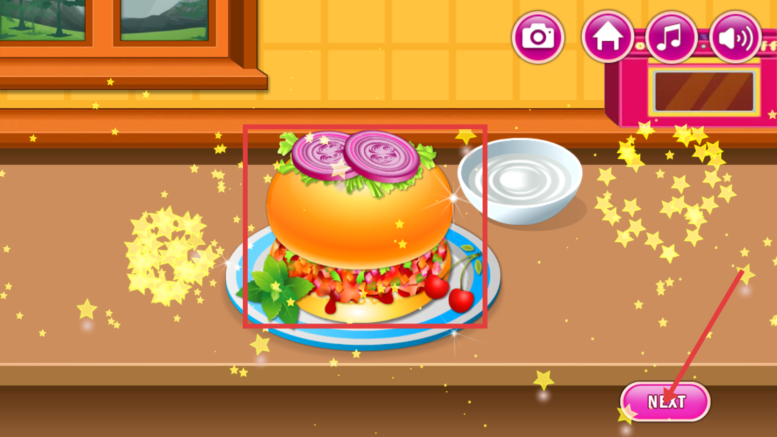 4、当汉堡装饰完毕,界面显示带有星星特效的成品时,点击右下角的【NEXT】按钮,可继续进行后续操作或制作下一道菜。