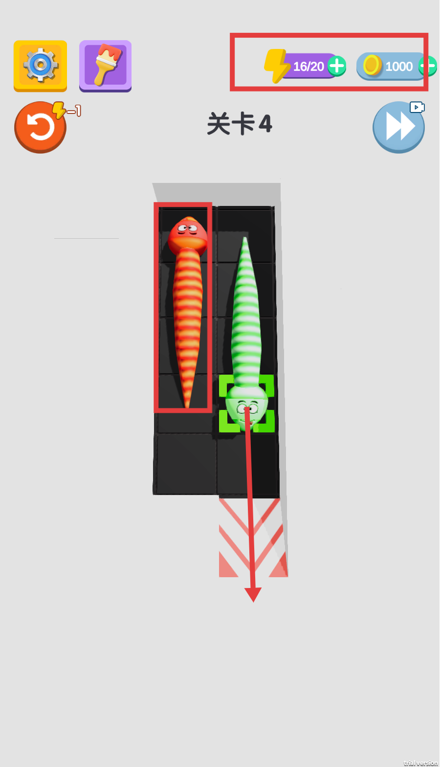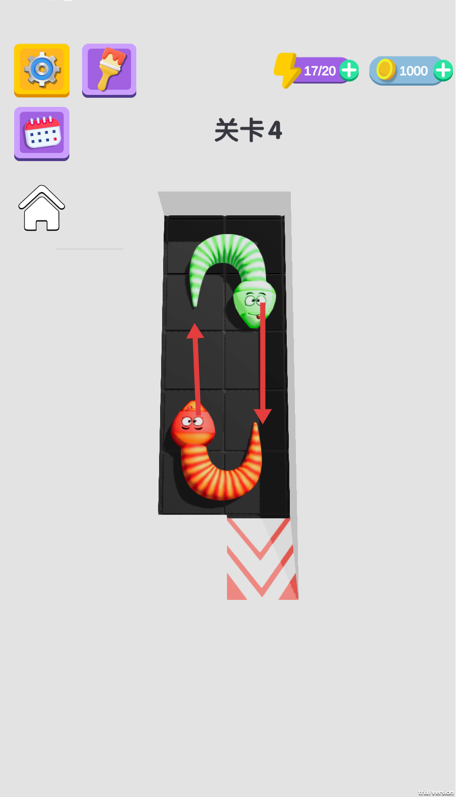 2、进入【关卡4】后,观察红绿两条蛇的初始布局,规划移动路线,操控红色蛇向上、绿色蛇向下移动,调整它们的位置。