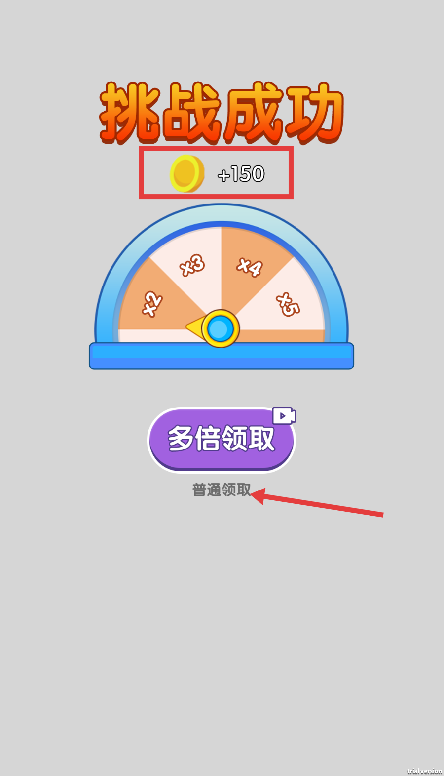 4、成功让蛇到达目标位置后,挑战成功,可选择【普通领取】获得+150金币奖励,也可通过【多倍领取】获取更多金币。
