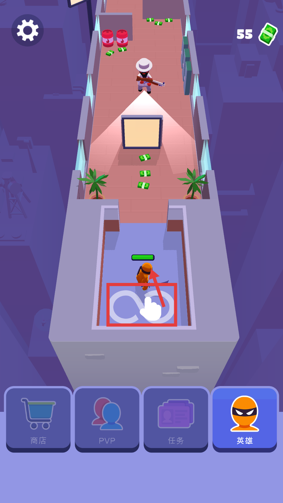 1、进入游戏后,操控角色站在标记区域,准备潜入场景,留意周围散落的钞票,为后续收集做准备。