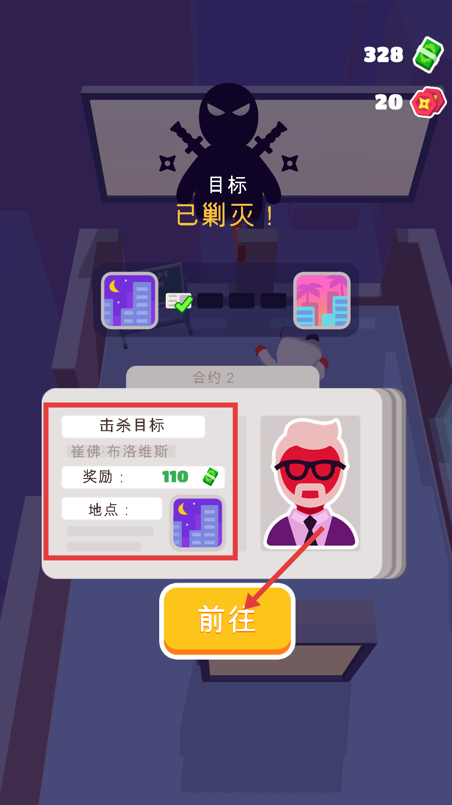 4、成功剿灭目标“崔佛·布洛维斯”后,可获得110钞票奖励,点击【前往】按钮,继续挑战下一个合约任务。