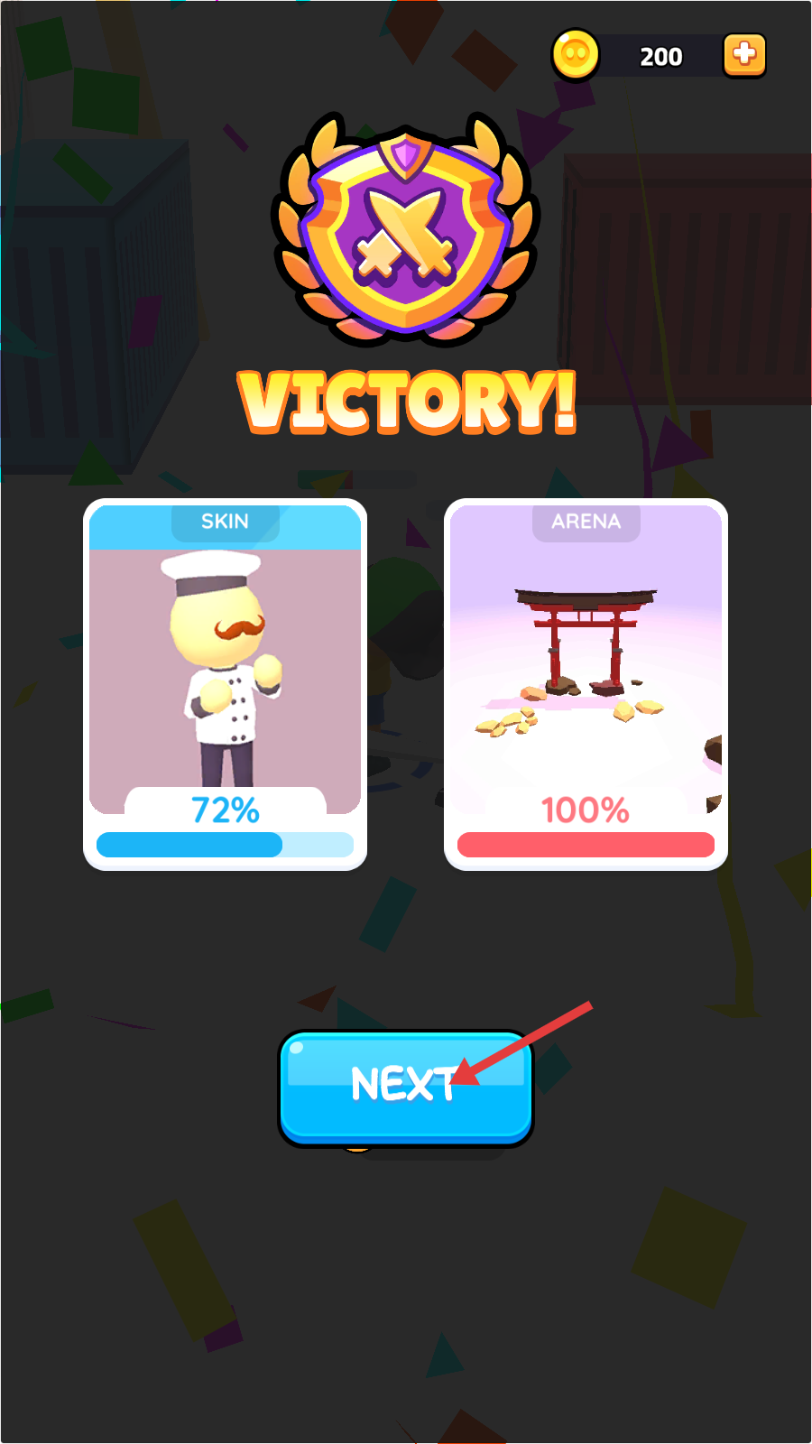 4、战斗胜利后,界面显示【VICTORY!】,可获得金币,还能看到皮肤与竞技场进度,点击【NEXT】继续游戏。