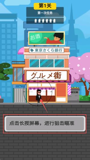 3、如何进行射击瞄准?在关卡中,长按屏幕进行射击瞄准,准备攻击黑衣人。