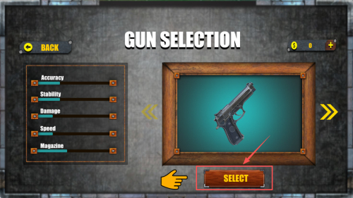 2、如何选择武器?在“GUN SELECTION”界面,选择一把枪并点击“SELECT”确认。