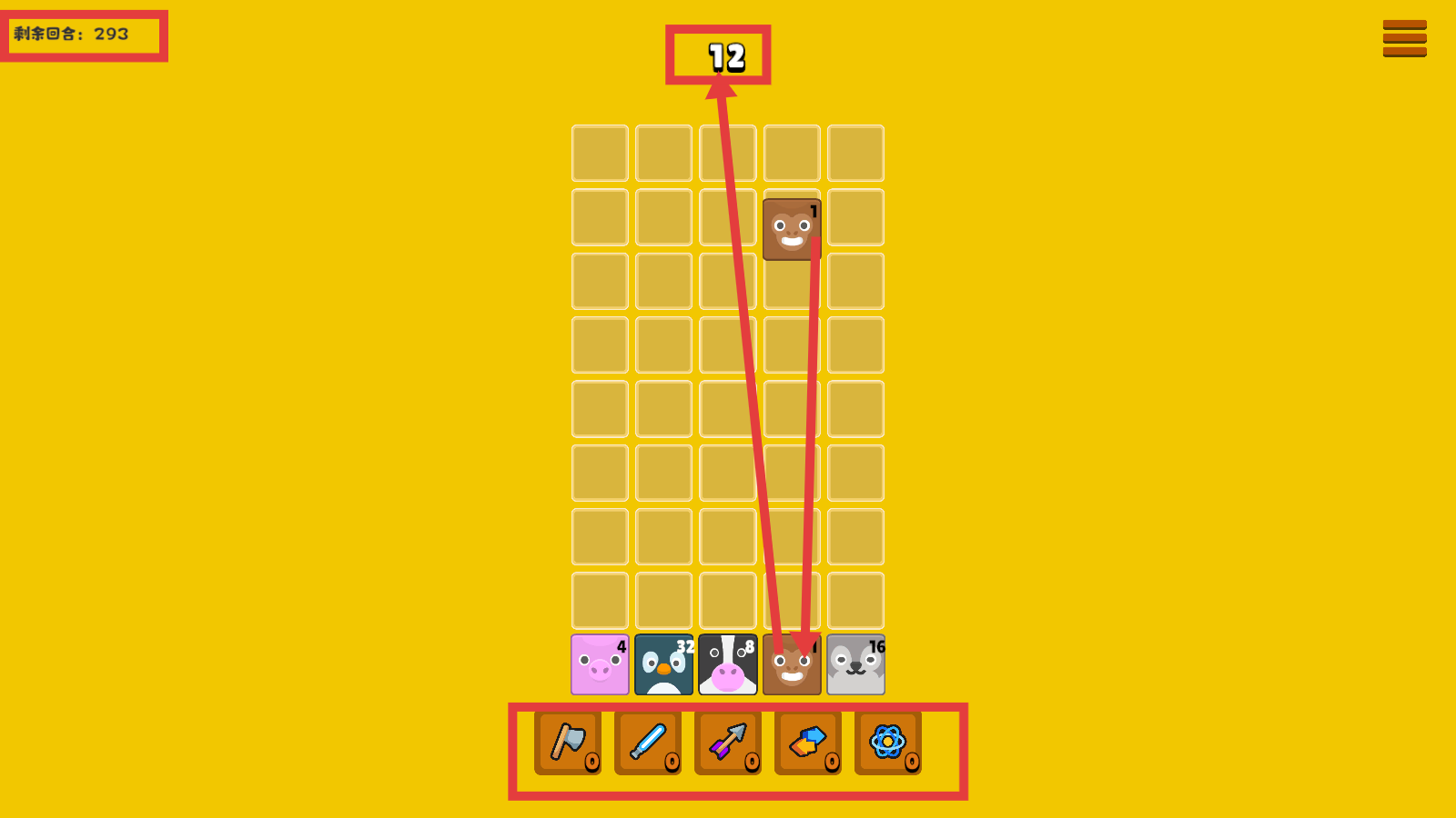 3、合并方块要注意剩余回合数,可借助下方工具辅助,合并后得分提升(如到【12】),力争更高分数。