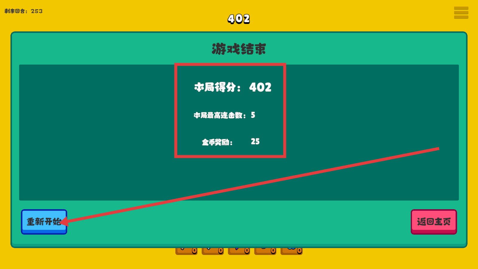 4、挑战结束后,查看本局得分(如402)、最高连击数与金币奖励(如25),点击【重新开始】可再次挑战。