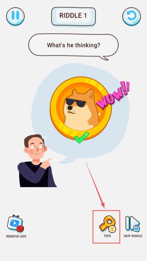 2、接着,观察题目“What's he thinking?”并点击“TIPS”获取提示。